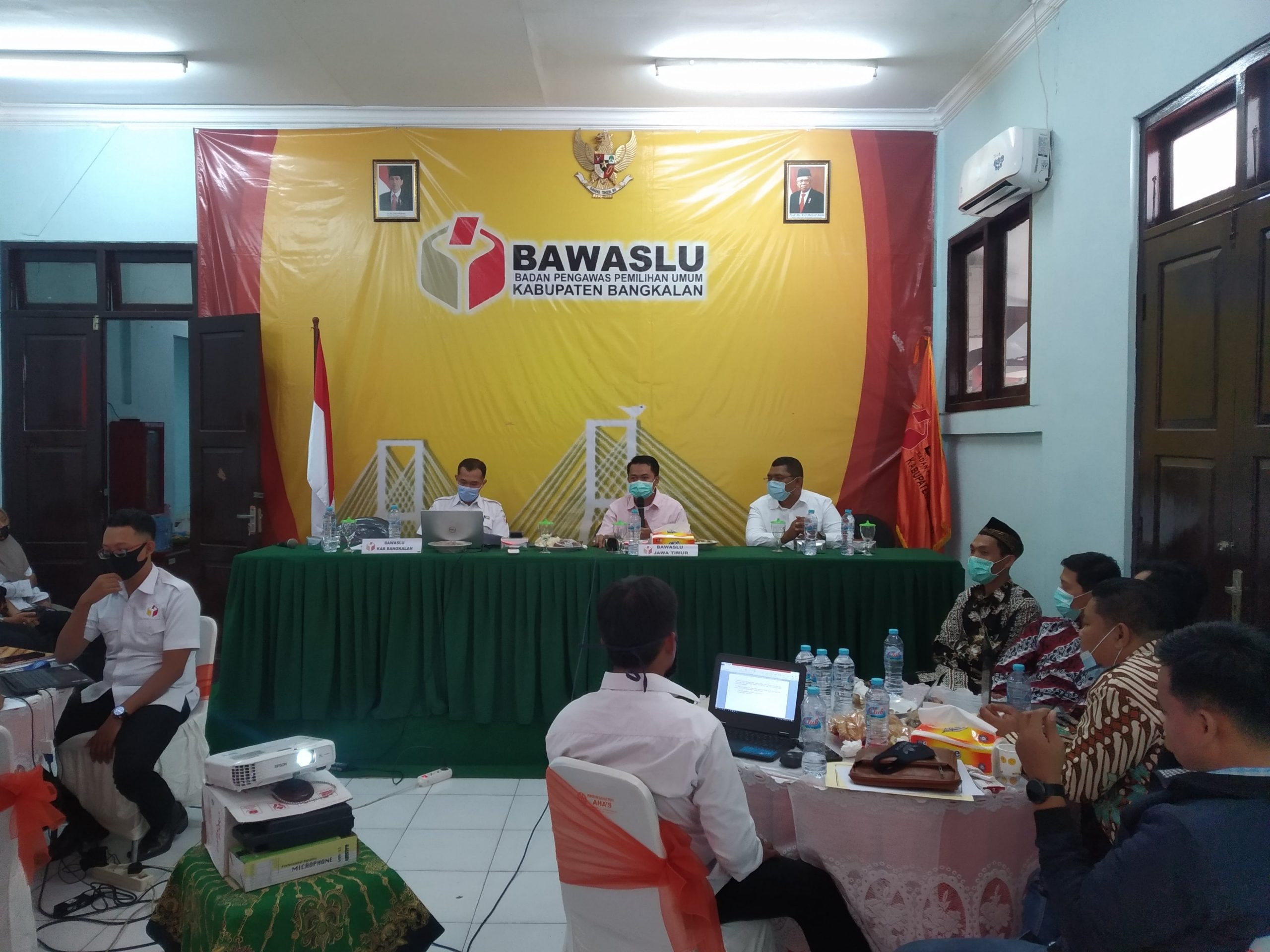 Bangkalan. Anggota Bawaslu Provinsi Jawa Timur Aang Khunaifi memberikan arahan kepada Koordinator Divisi dan staf pengawasan Bawaslu Kabupaten/Kota dalam acara Rapat Evaluasi Daftar Pemilih Sementara Pemilihan Tahun 2020 dan Penyusunan Daftar Pemilu Berkelanjutan yang bertempat di kantor Bawaslu Kabupaten Bangkalan, Rabu (7/10/2020).