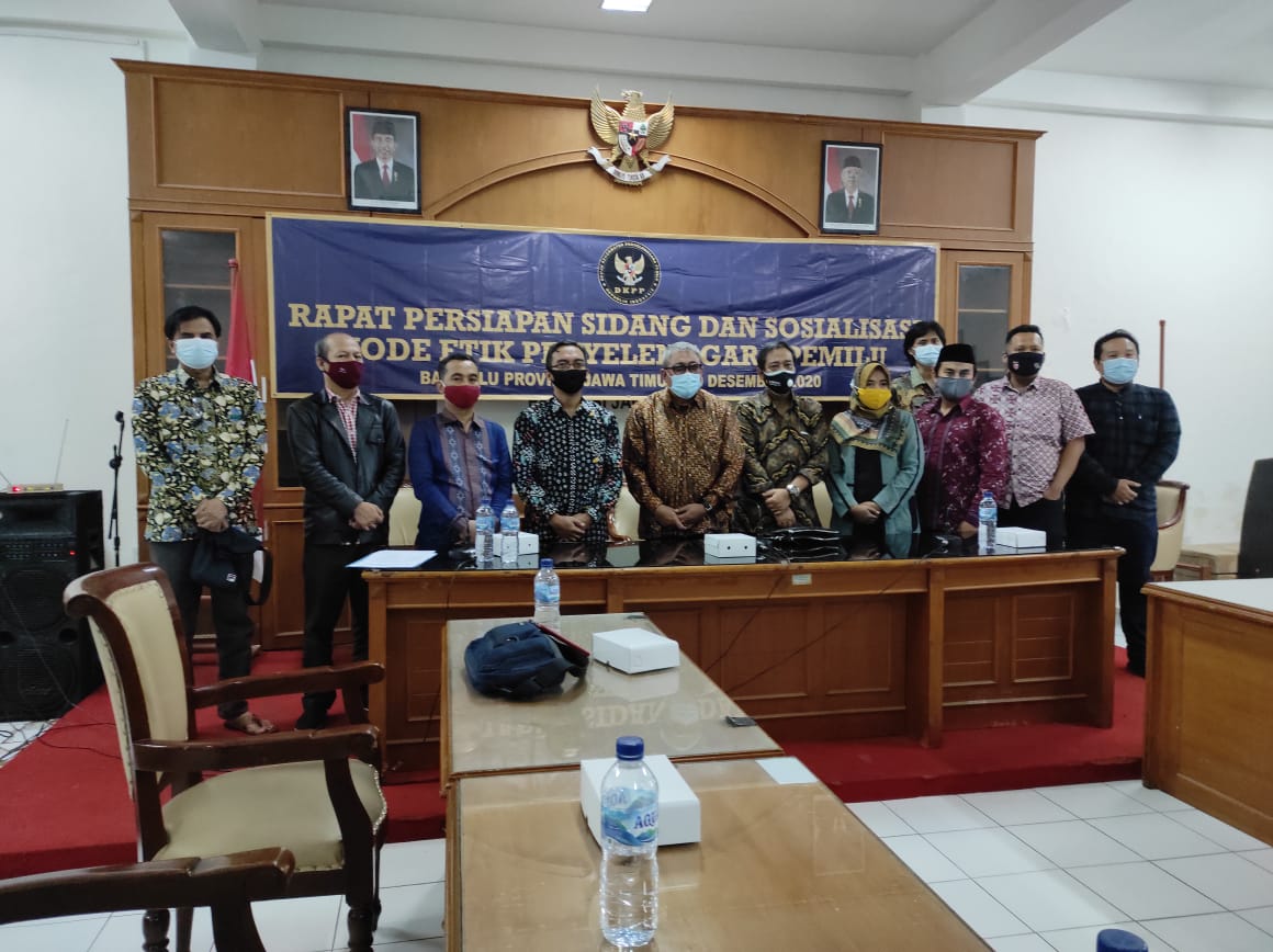 Surabaya. Dewan Kehormatan Penyelenggara Pemilu Republik Indonesia (DKPP RI) menggelar rapat persiapan sidang dan sosialisasi kode etik penyelenggara pemilu. Rapat itu diselenggarakan pada hari Minggu 20 Desember 2020 di Kantor Bawaslu Provinsi Jawa Timur.