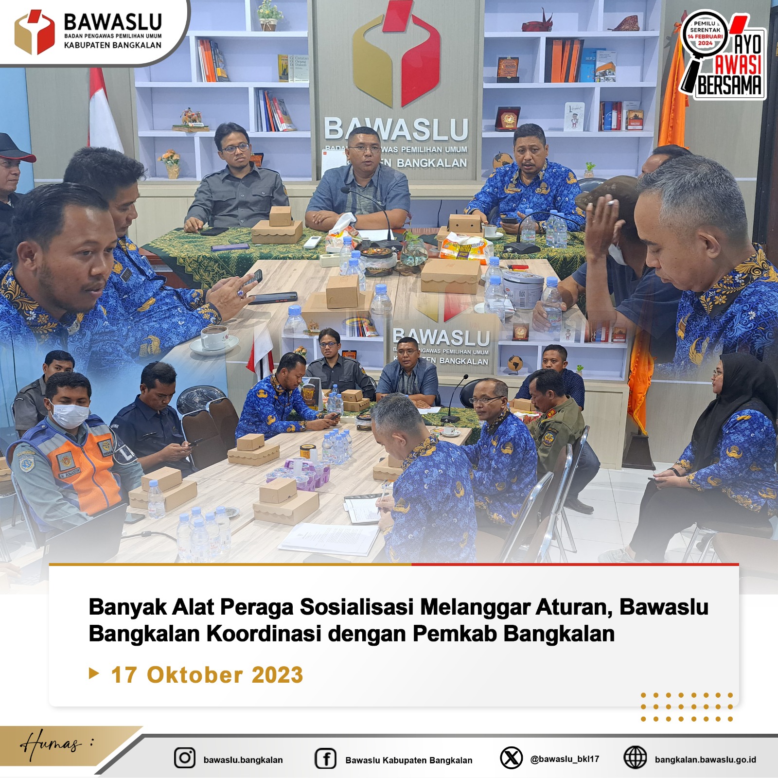 Bawaslu dan Pemerintah Kabupaten Bangkalan melakukan rapat koordinasi menyikapi bayaknya Alat Peraga Sosialisai (APS) yang melanggar aturan, Selasa (13/10) di Kantor Bawaslu Bangkalan.