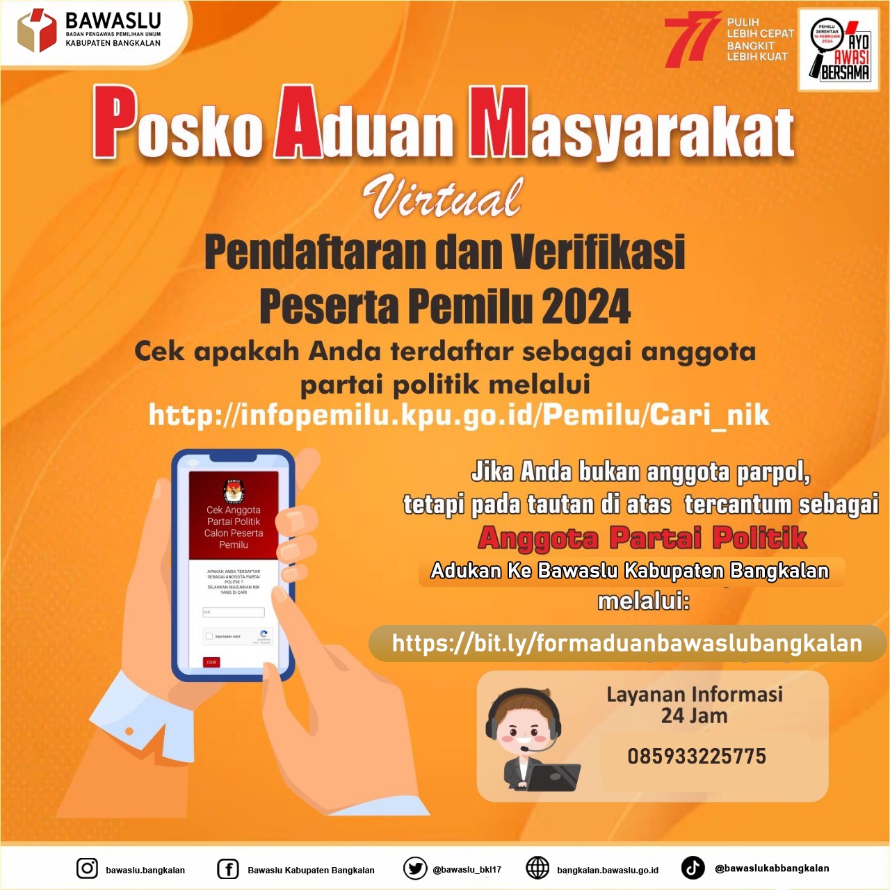 Upaya pencegahan dalam proses pendaftaran dan verifikasi partai politik peserta pemilu tahun 2024, Bawaslu Kabupaten Bangkalan telah membuka posko pengaduan masyarakat. Tujuannya untuk menerima aduan dan keberatan masyarakat jika terdapat adanya penggunaan data diri yang terdapat dalam Sistem Informasi Partai Politik (SIPOL), Senin (15/08/22).