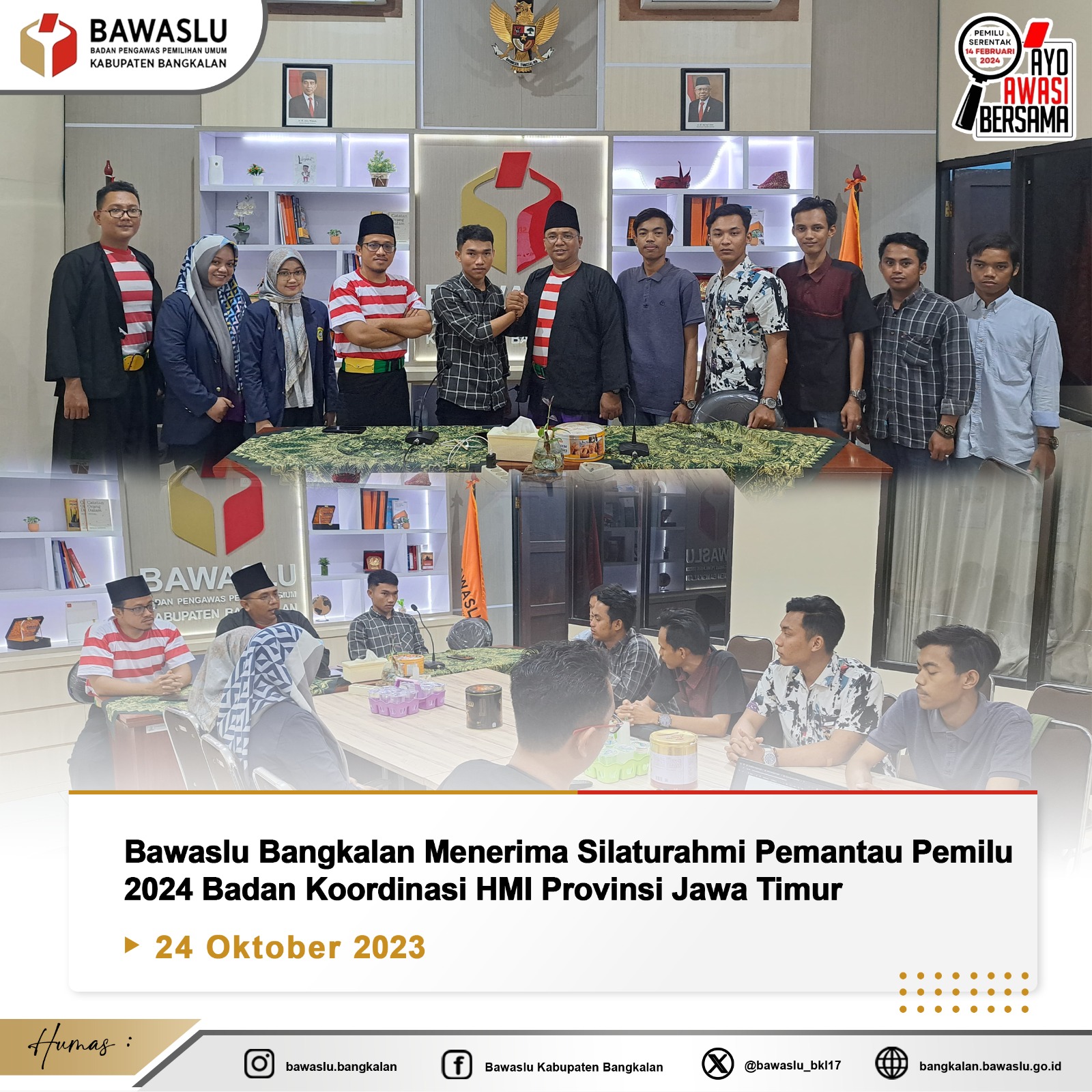 Bawaslu Kabupaten Bangkalan menerima silaturahmi pemantau pemilu Badan Koordinasi (Badko) Himpunan Mahasiswa Islam (HMI) Jawa Timur, Selasa (24/10/23). Acara silaturhmi ditemui oleh Ahmad Mustain Saleh dan Malikul Amin selaku Ketua dan anggota Bawaslu Bangkalan di ruang rapat Kantor Bawaslu Bangkalan.