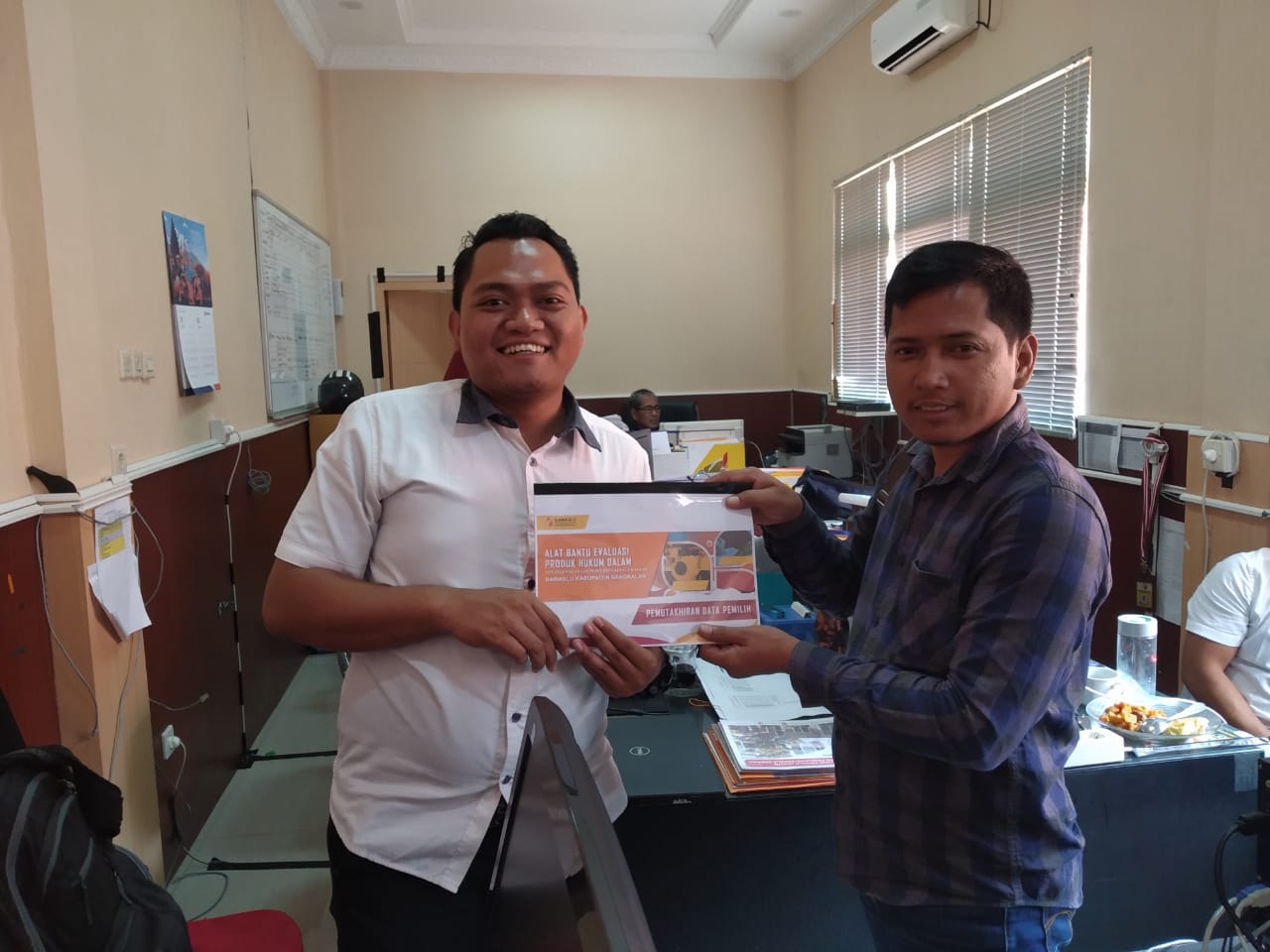 Muhlis (Kanan) anggota Bawaslu Bangkalan saat menyerahkan alat bantu produk hukum pemilihan kepala daerah. [/caption]