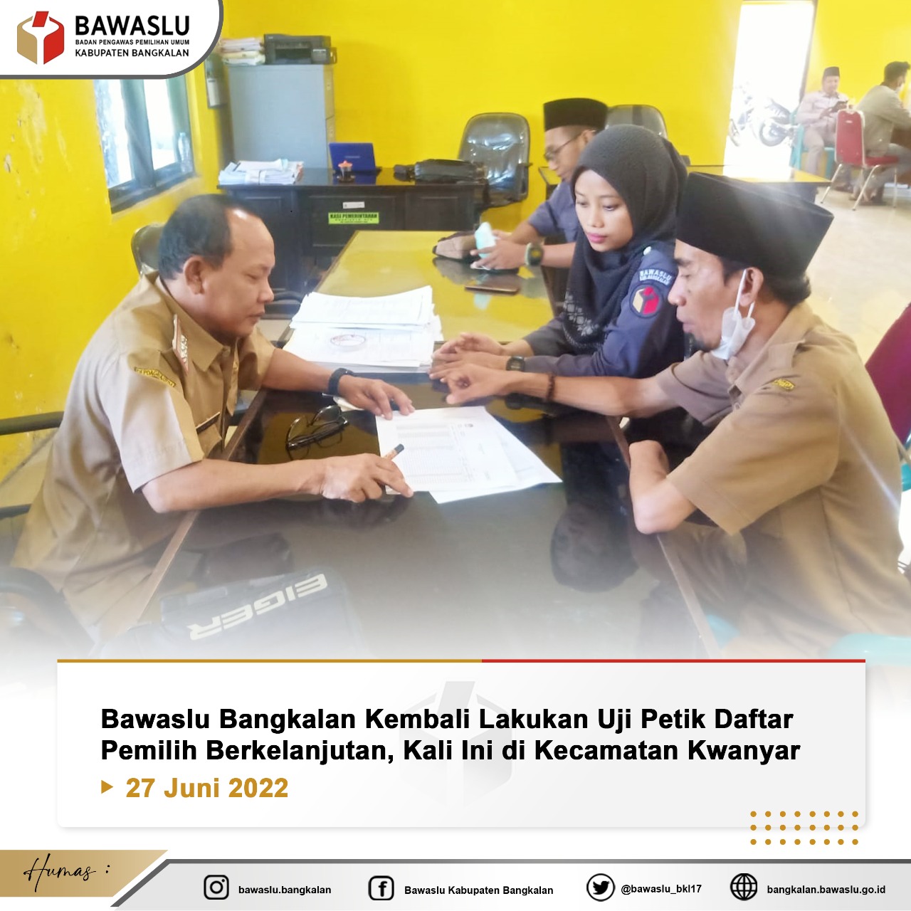 Bawaslu Kabupaten Bangkalan kembali melaksanakan uji petik Dafta Pemilih Berkelanjutan (DPB) di kecamatan Kwanyar, Senin (27/06/22). Uji petik ini dalam rangka memastikan data pemilih terdata dengan baik. Yakni pemilih yang memenuhi syarat dan pemilih yang tidak memenuhi syarat sebagaimana diatur dalam peraturan perundang-undangan.