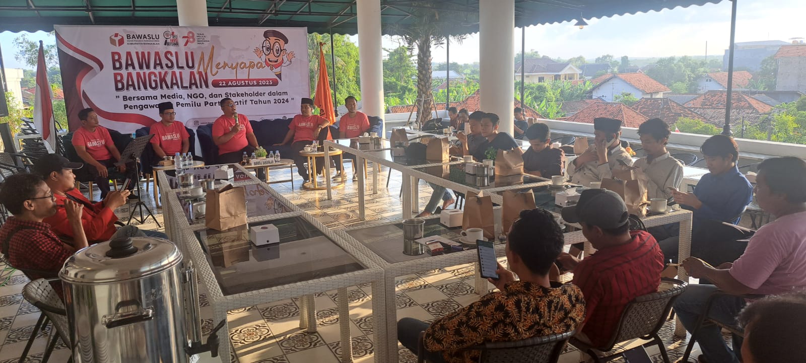 Kabupaten Bangkalan periode 2023-2208, lima Komisioner Bawaslu Bangkalan menyapa Media, NGO dan Stakeholder Kepemiluan, Selasa (22/08/23) The Sky Resto Bangkalan.