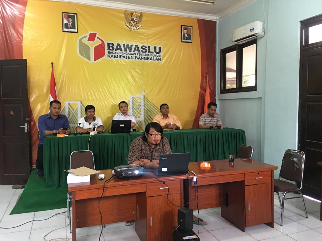 Komisioner dan Koorsek Bawaslu Bangkalan saat mengikuti video Conferensi Bawaslu Jatim