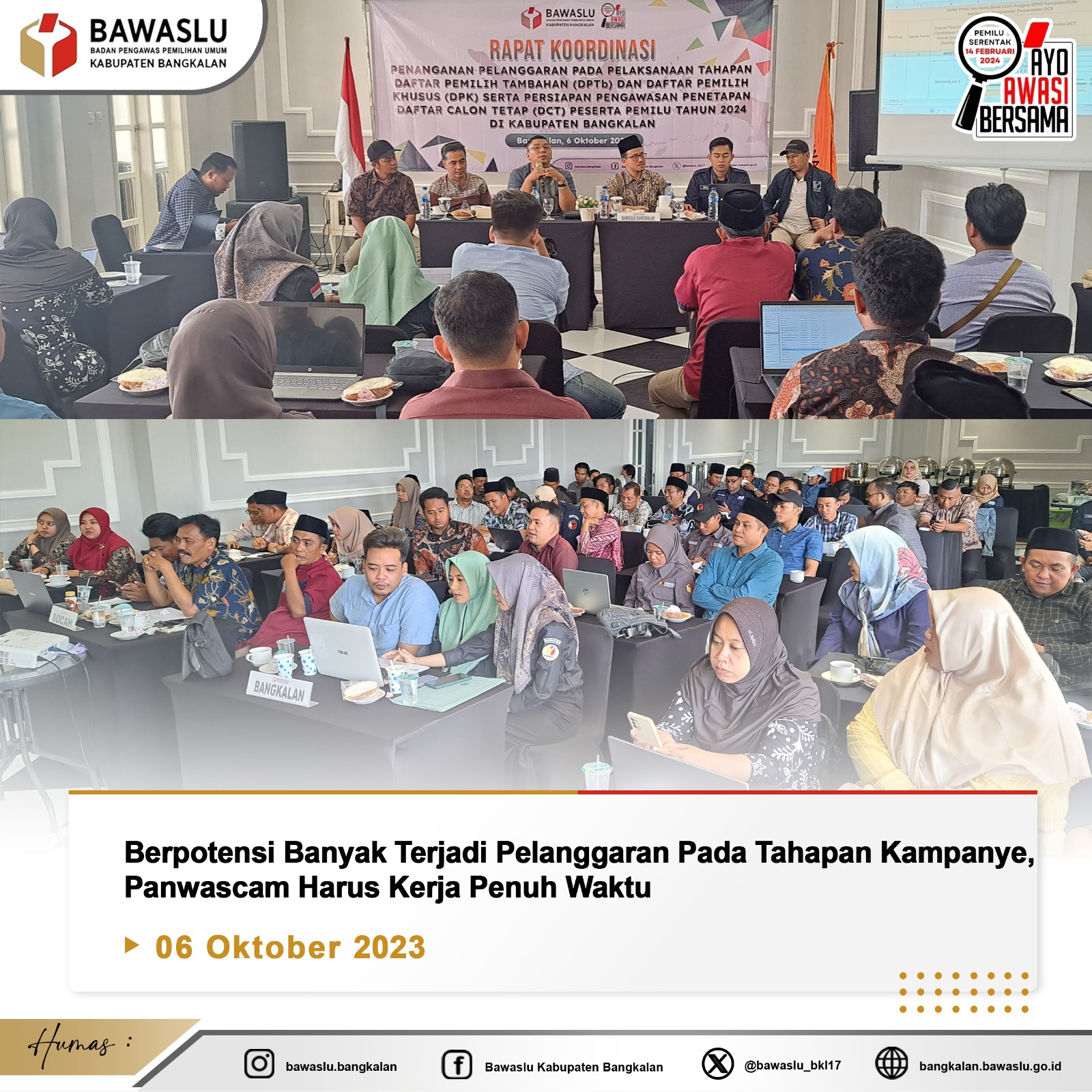 Mamasuki tahapan kampanye pada Pemilu tahun 2024, Panwascam harus kerja penuh waktu, hal tersebut disampaikan Ahmad Mustain Saleh Ketua Bawaslu Bangkalan saat rapat koordinasi penanganan pelanggaran dengan Panwascam, Jumat (06/10/23) di The Sky Bangkalan.