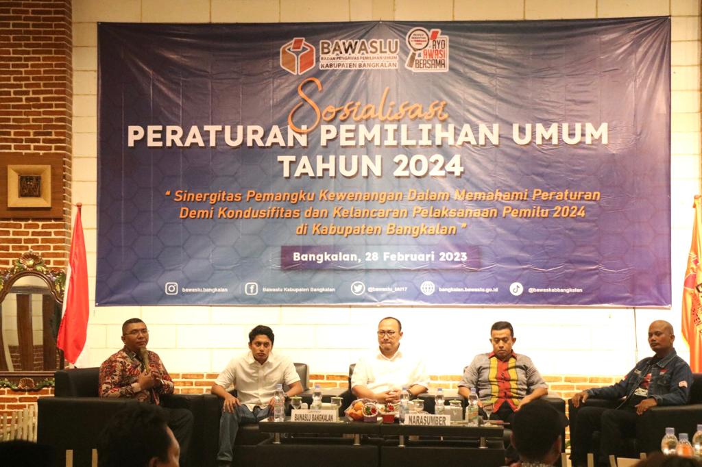 Bawaslu Bangkalan gelar sosialisasi peraturan pemilu tahun 2024 dengan tema sinergitas pemangku kewenangan dalam memahami peraturan demi kondusifitas dan kelancaran pelaksanaan pemilu tahun 2024 di Kabupaten Bangkalan, Selasa (28/02/23) di Cafe Dapur Sambal Bangkalan.