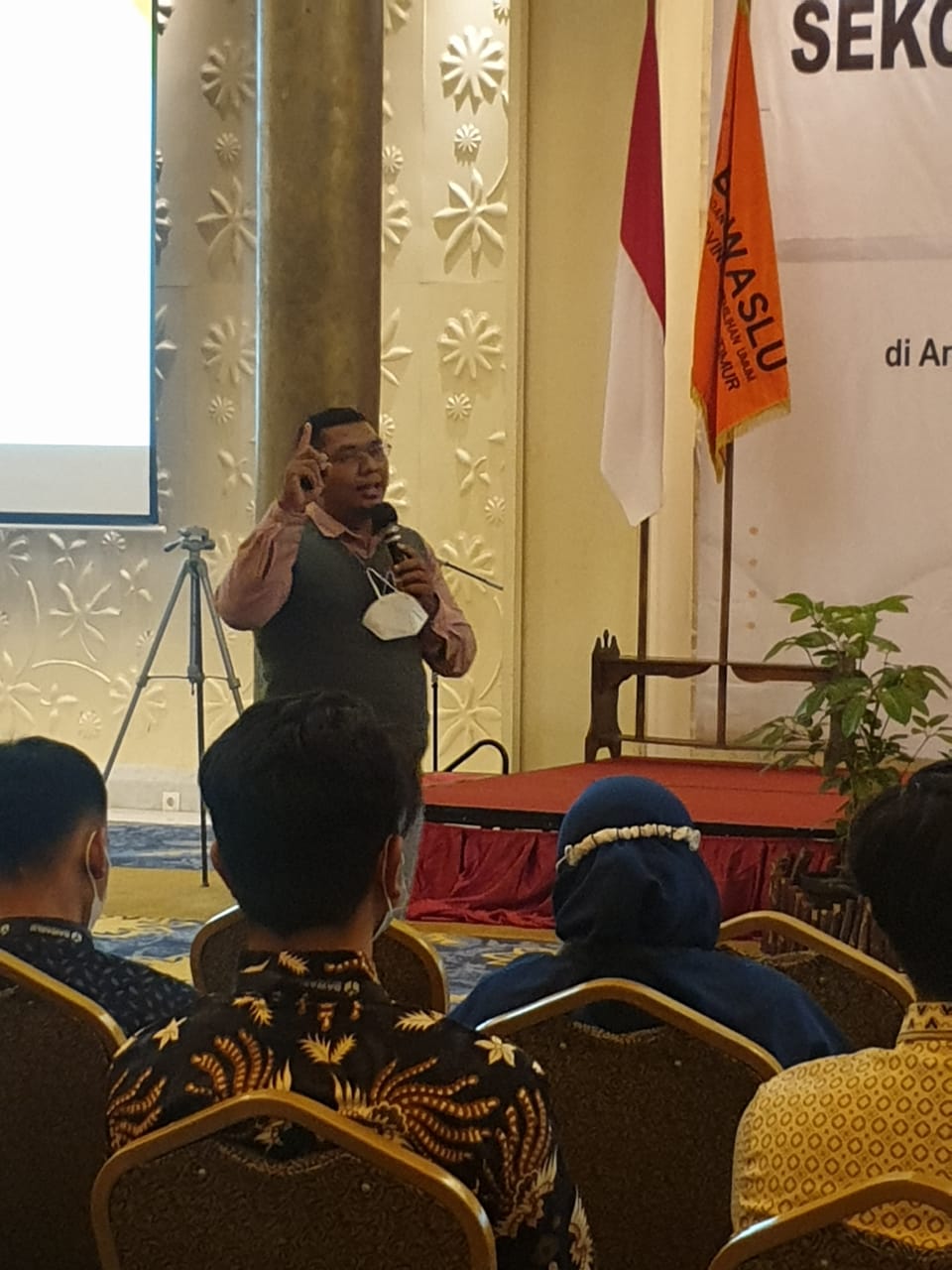 Ahmad Mustain Saleh yang ditunjuk sebagai narasumber pada sekolah kader pengawasan partisipatif tingkat menengah tahun 2021 tersebut berkesempatan berbagi pengetahuan tentang teknik komunikasi massa.