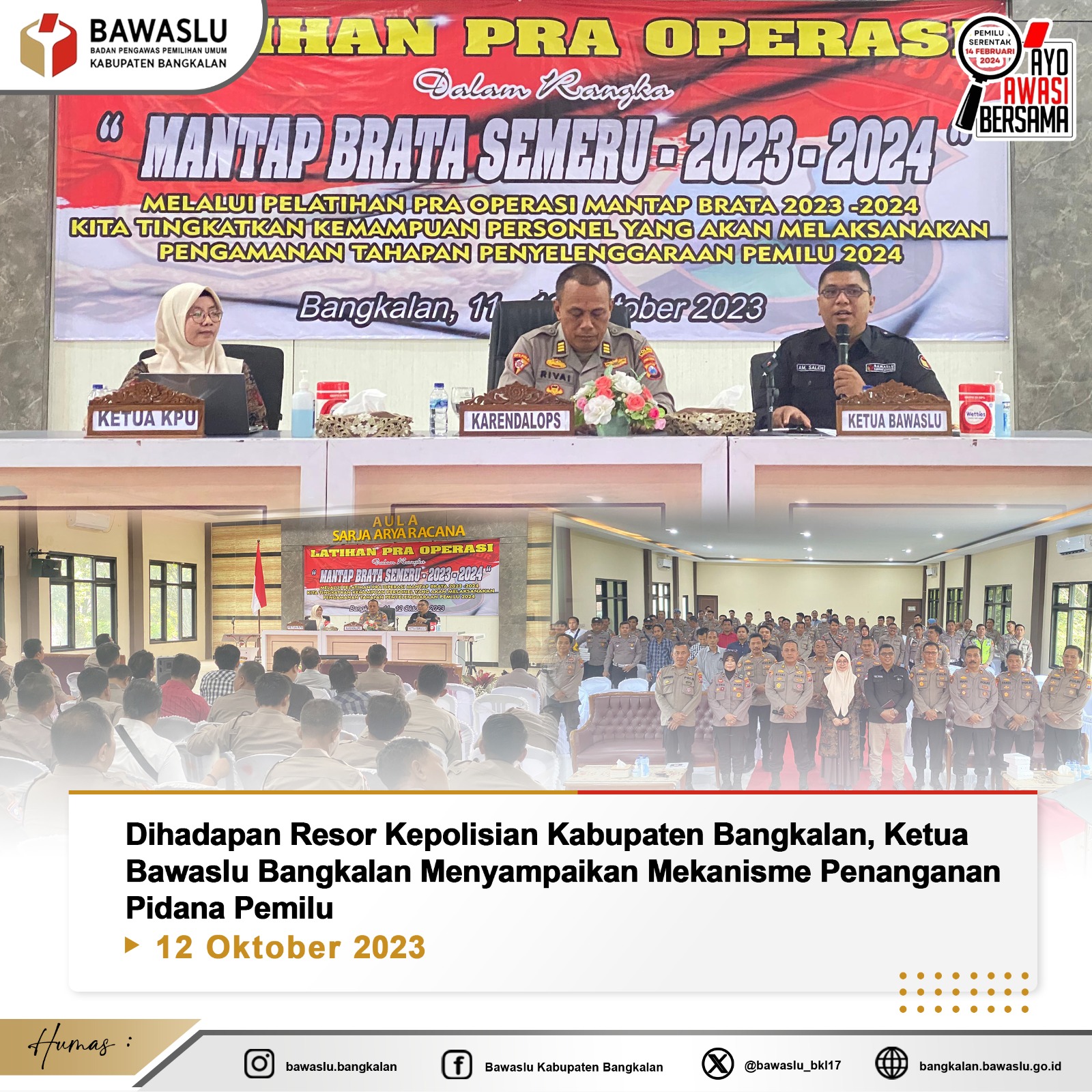 Ketua Bawaslu Bangkalan Ahmad Mustain Saleh menjelaskan mekanisme dugaan tindak pidana pemilu menghadapi pemilu tahun 2024, Kamis 12 Oktober 2023 di Mapolres Bangkalan. Berdasarkan undang-undang pemilu, Bawaslu sebagai pintu masuk atas penanganan pelanggaran, termasuk dugaan tindak pidana pemilu. Hal itu disampaikan saat menjadi narasumber pada acara latihan pra operasi mantap brata semeru 2023-2024 Polres Bangkalan.