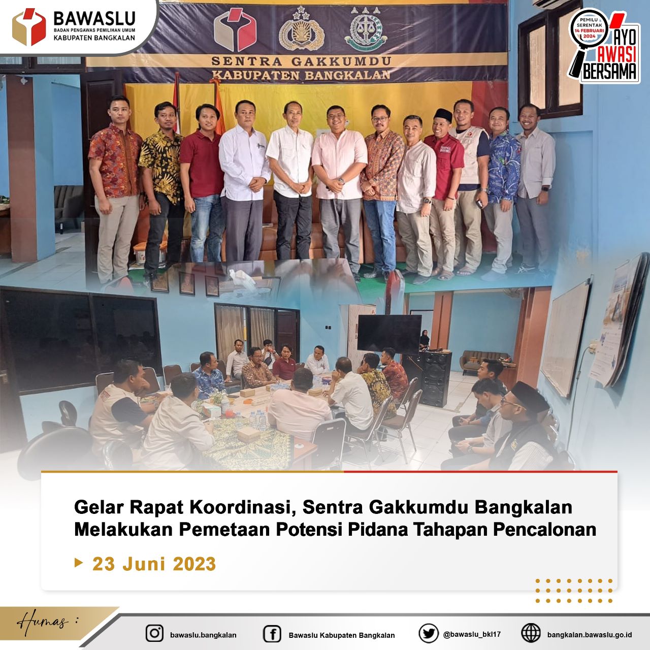 Potensi pelanggaran administrasi dan tindak pidana pemilu dalam tahapan pencalonan anggota DPRD pada Pemilu 2024 rawan terjadi. Kerawanan itu, misalnya dokumen pencalonan Bacaleg didapat dengan cara tidak benar dan sah ataupun palsu. Hal itu disampaikan Ahmad Mustain Saleh ketua Bawaslu Bangkalan saat gelar rapat koordinasi dengan Sentra Gakkumdu Kabupaten Bangkalan Jumat (23/06/23) di Kantor Bawaslu Kabupaten Bangkalan.