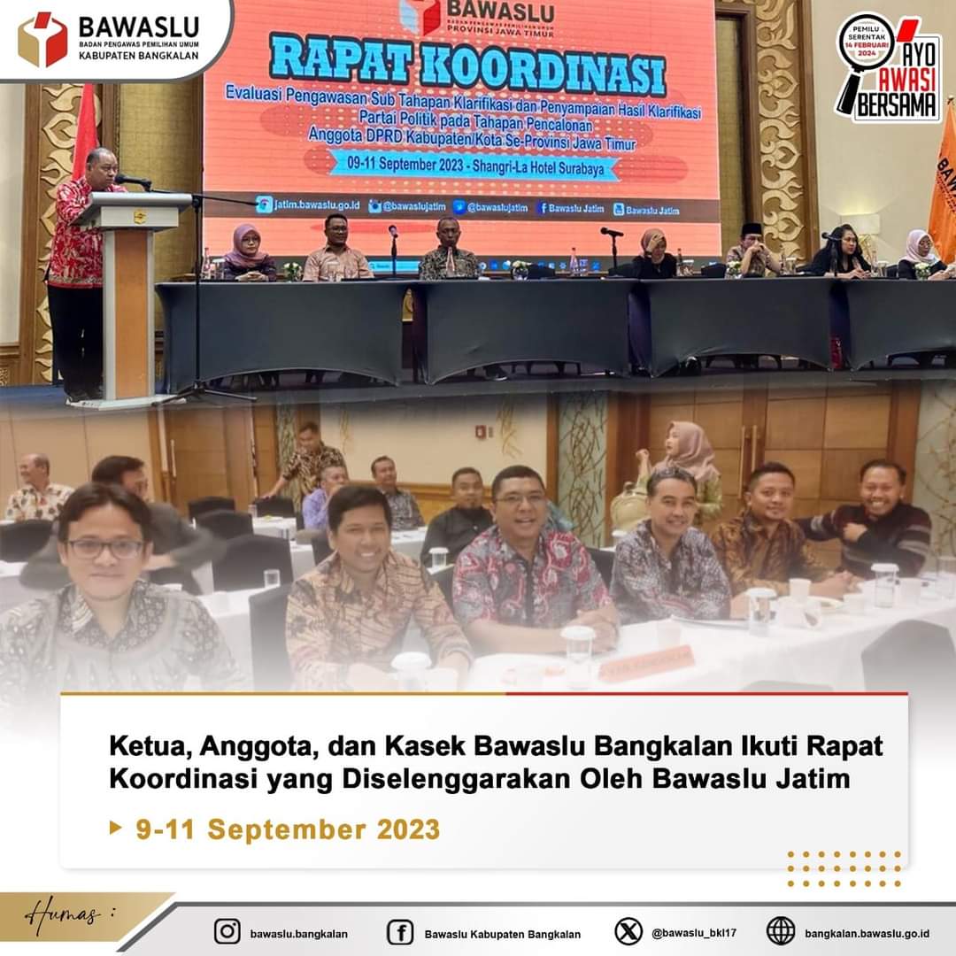 Untuk pertama kalinya pasca dilantik, Ketua dan anggota Bawaslu Kabupaten Bangkalan periode 2023-2028 mengikuti rapat pimpinan yang diselenggarakan Bawaslu Provinsi Jawa Timur, 09-11 September 2023 di Shangri-La Hotel Surabaya.