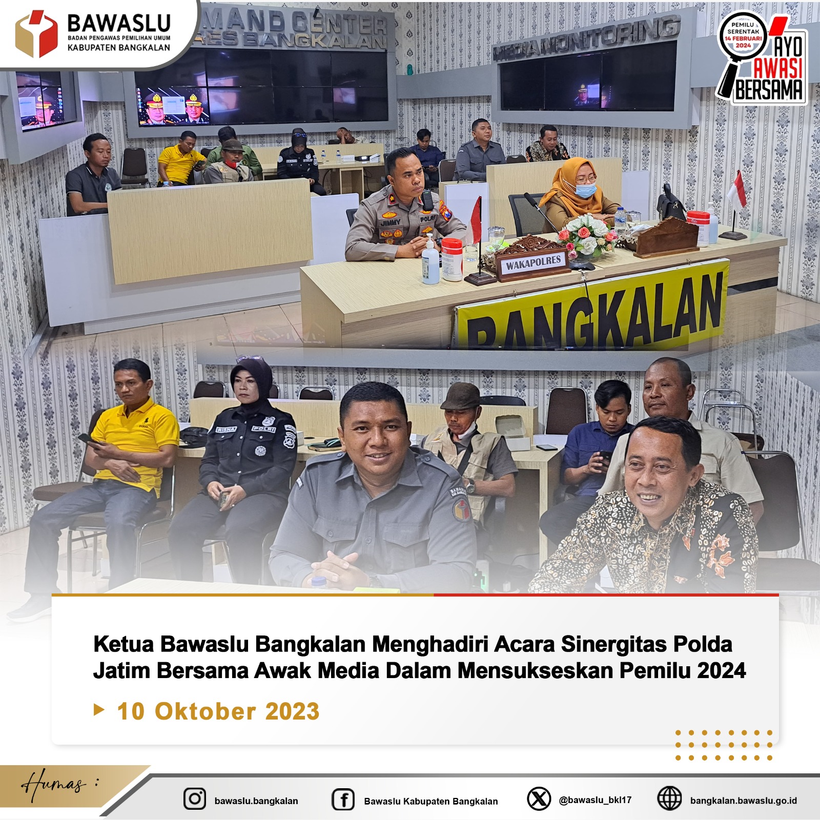 Ketua Bawaslu Bangkalan Ahmad Mustain Saleh menghadiri acara sinergitas Polisi Daerah Jawa Timur bersama awak media dalam mensukseskan pemilu 2024 secara daring, Selasa (10/10/23) di Polres Bangkalan.