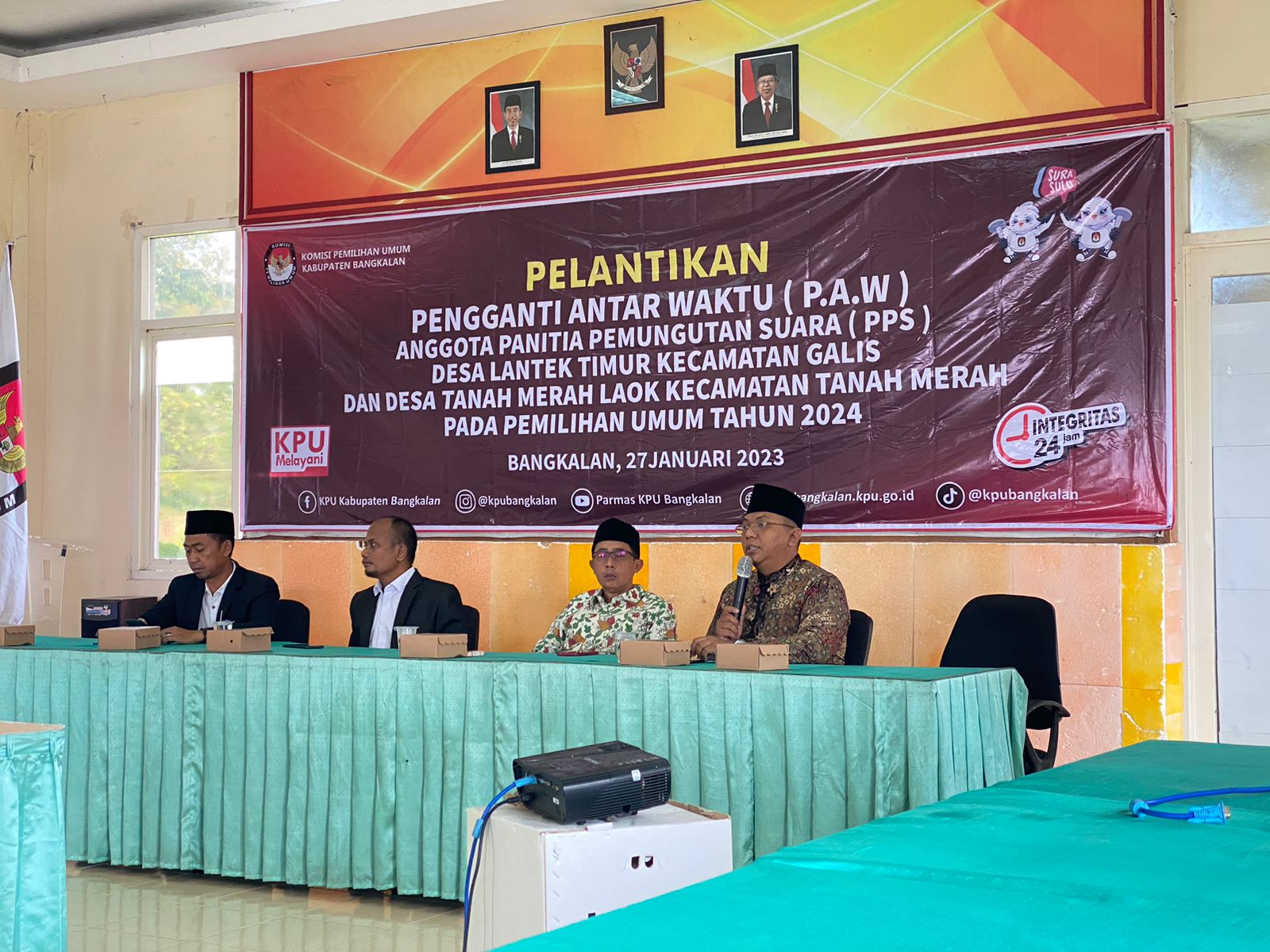 Ketua Bawaslu Kabupaten Bangkalan Ahmad Mustain Saleh menghadiri pelantikan Pengganti Antar Waktu (PAW) Panitia Pemungutan Suara (PPS) Desa Lantek Timur Kecamatan Galis dan Desa Tanah Merah Laok Kecamatan Tanah Merah, Jum'at (27/01/23) di Aula Kantor KPU Bangkalan.