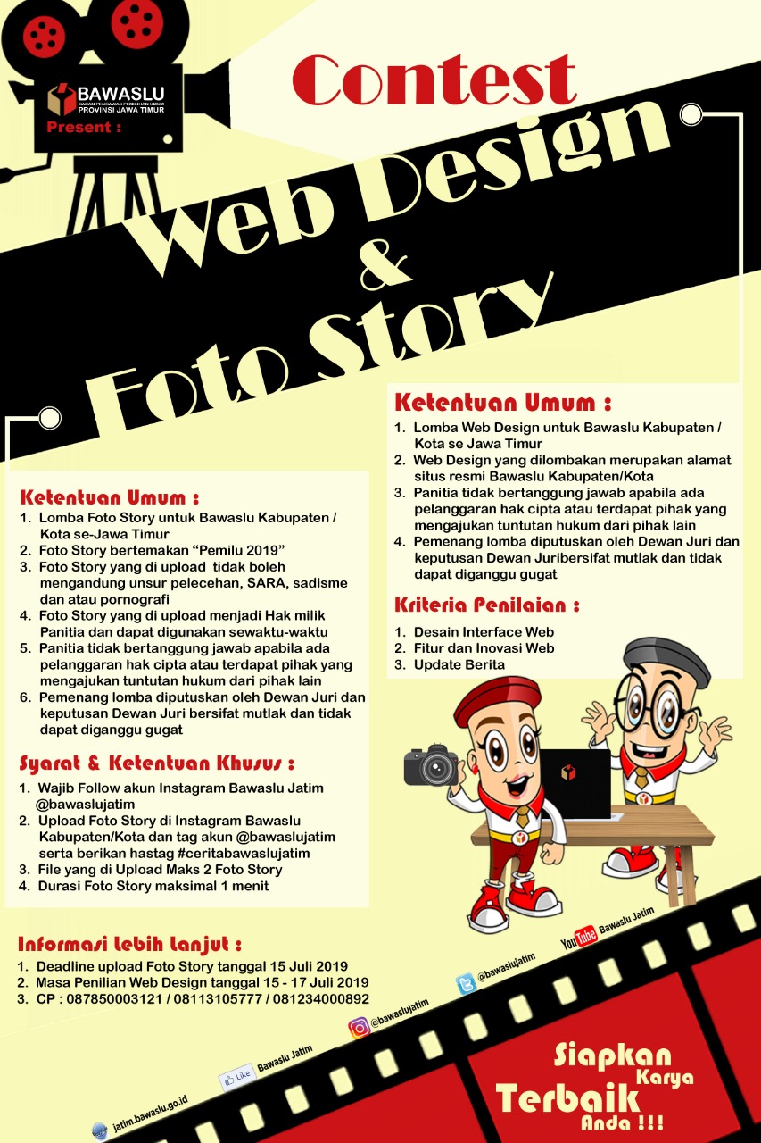 Lomba Web Design dan Membuat Photo Story Bawaslu Jatim humas | Selasa, Juli 16, 2019 - 07:21 https://www.facebook.com/panwaslu.kabbangkalan.5/posts/507614419983405?notif_id=1563260831438717¬if_t=feedback_reaction_generic Tag Berita Pengumuman Share Berita Terkini humas Kamis, November 20, 2025 - 18:52 Menutup Rangkaian Penguatan Kelembagaan, Bawaslu Jatim Mengusung Tema Semangat Kepahlawanan humas Minggu, November 16, 2025 - 22:42 Totok: Kerja Pengawas Pemilu di Non Tahapan Membangun Konsolidasi Demokrasi humas Sabtu, November 15, 2025 - 11:01 Menjaga Akurasi Data Pemilih, Coktas Momentum Mengajak Mayarakat Melakukan Perekaman e-KTP Lihat Lainnya