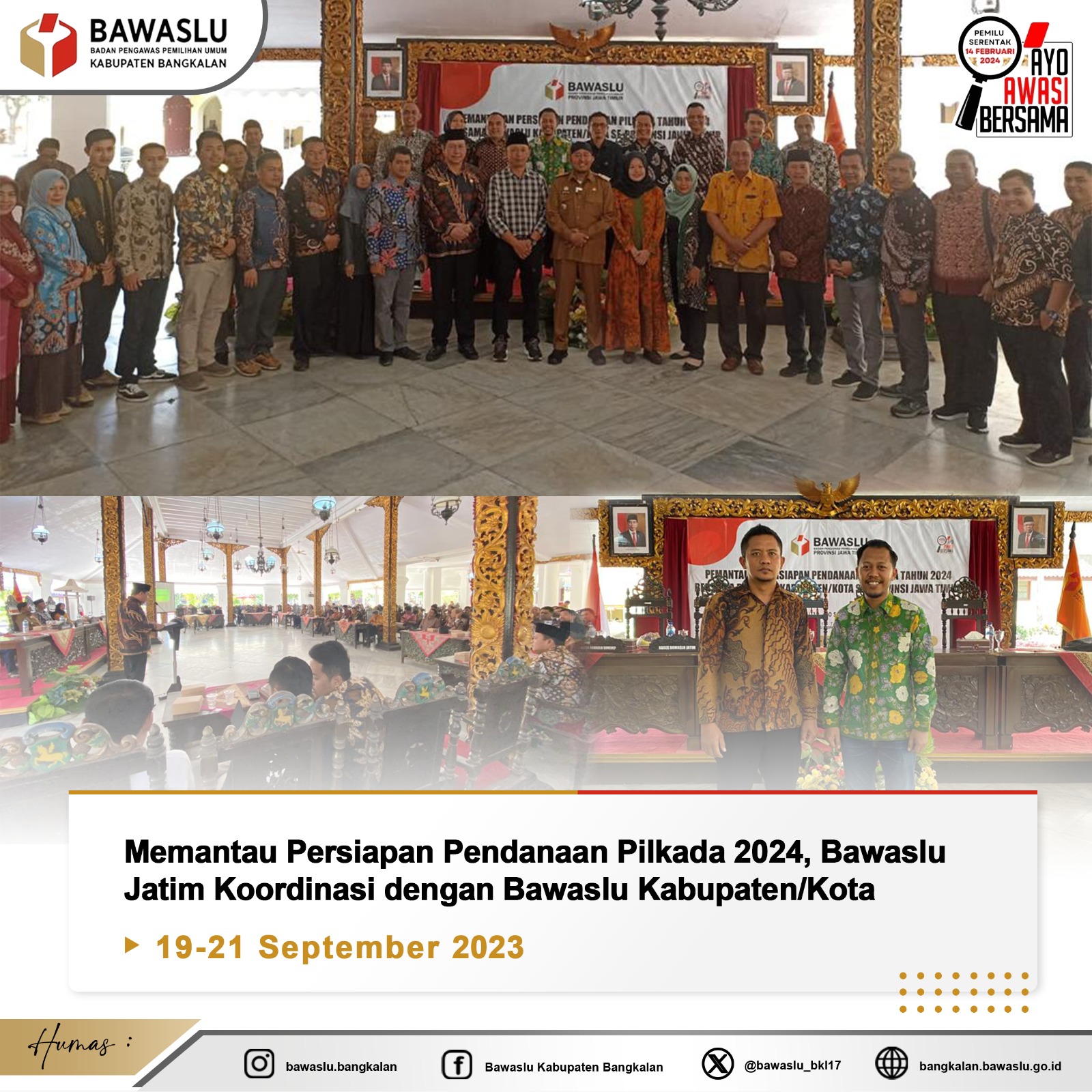 Pemantauan persiapan pendanaan pilkada 2024, Bawaslu Jatim rapat koordinasi dengan Bawaslu Kabupaten/kota, (19-21/09/23) di Sumenep. Acara yang berlangsung di Pendopo Pemerintah Kabupaten Sumenep dihadiri oleh A. Warist selaku ketua Bawaslu Jatim beserta anggota dan kepala sekretariat.