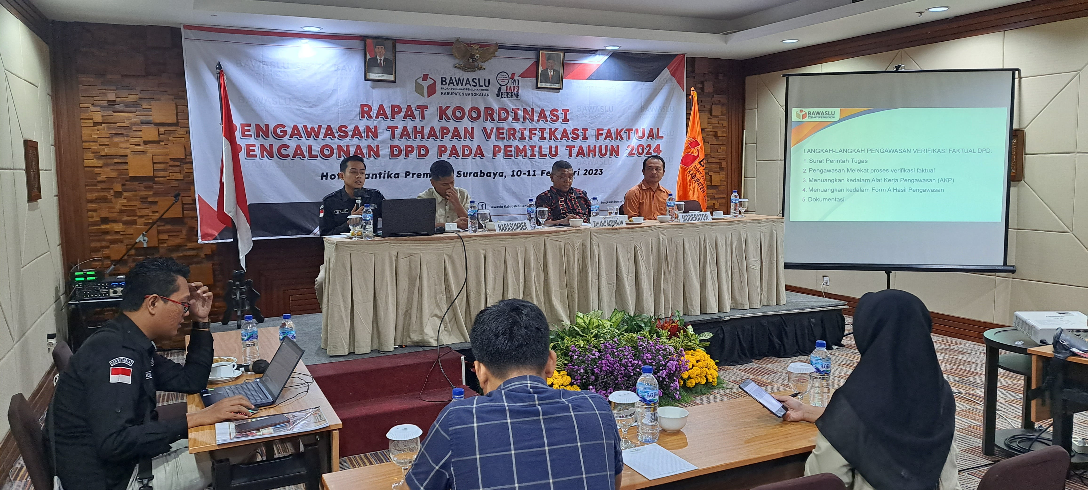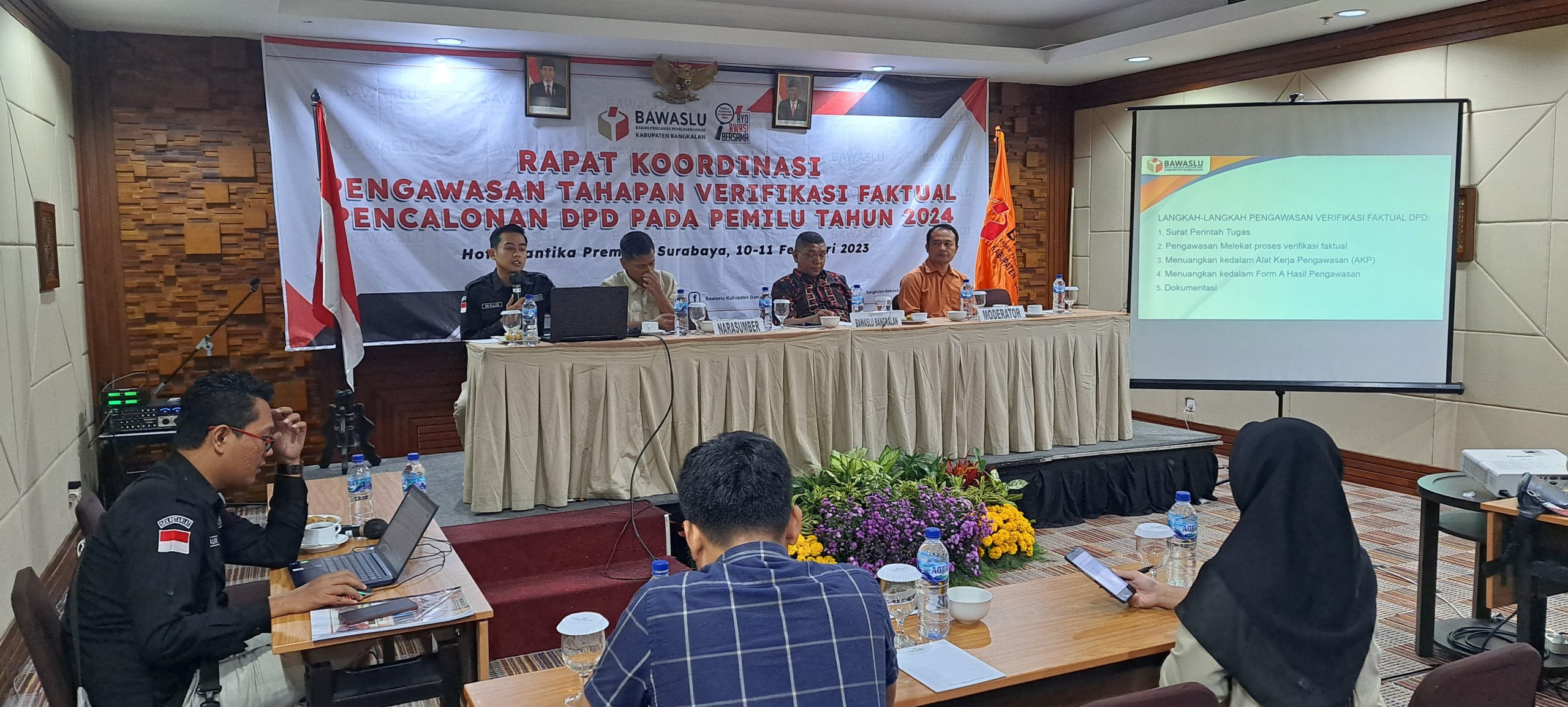 Rakor yang dilaksanakan pada tanggal (10-11/02/23) bertempat di Surabaya membahas tentang proses dan strategi pengawasan yang perlu dipersiapkan. Muhlis anggota Bawaslu Kabupaten Bangkalan menyampaikan, pengawasan verifikasi faktual untuk memastikan kebenaran, ketepatan syarat dukungan calon dengan pemberi dukungan.