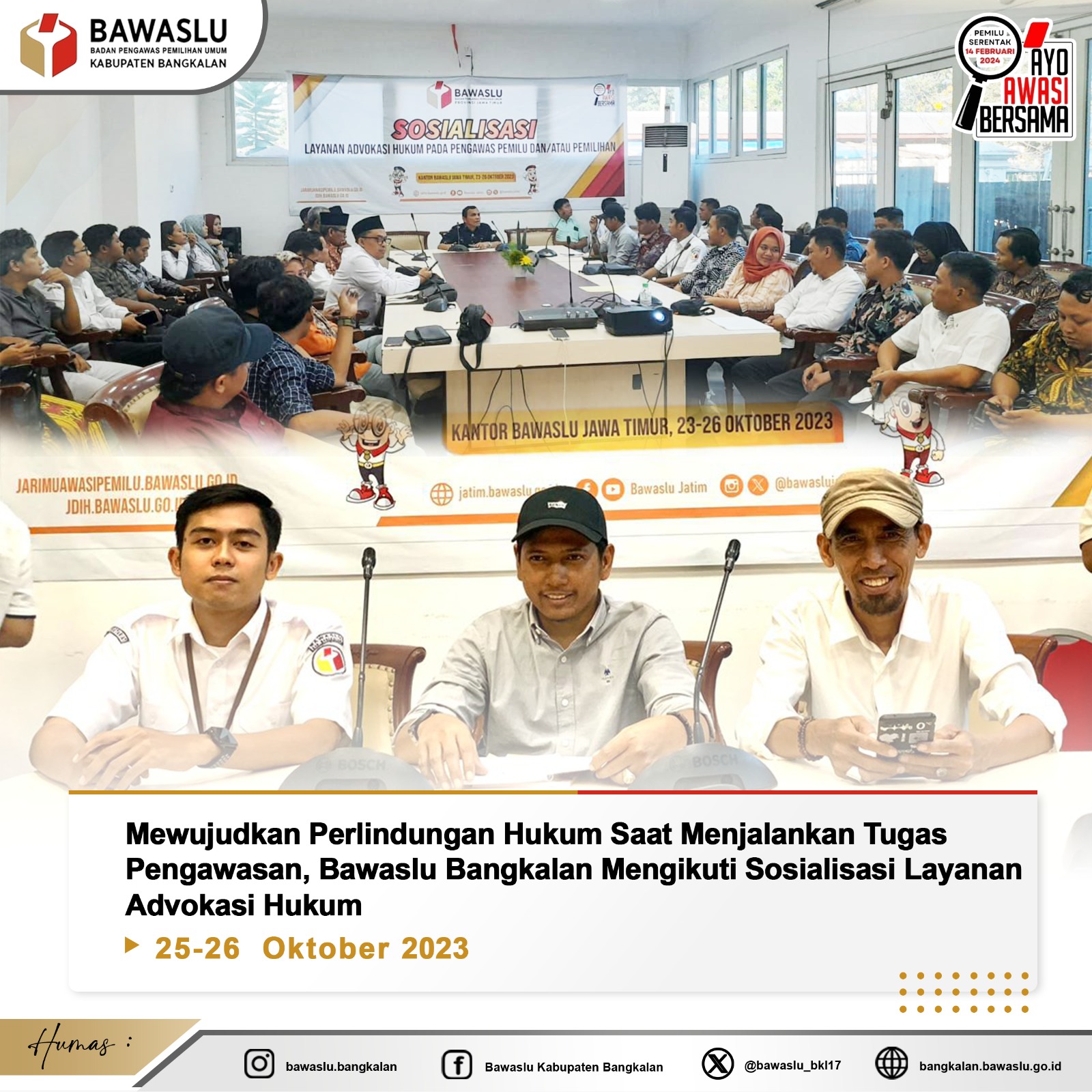 Bertempat di Kantor Bawaslu Jatim, Anggota Bawaslu Bangkalan Muhlis bersama kasubag dan staf mengikuti sosialisasi layanan advokasi hukum pada pengawas pemilu/pemilihan, (25-26/10/23).