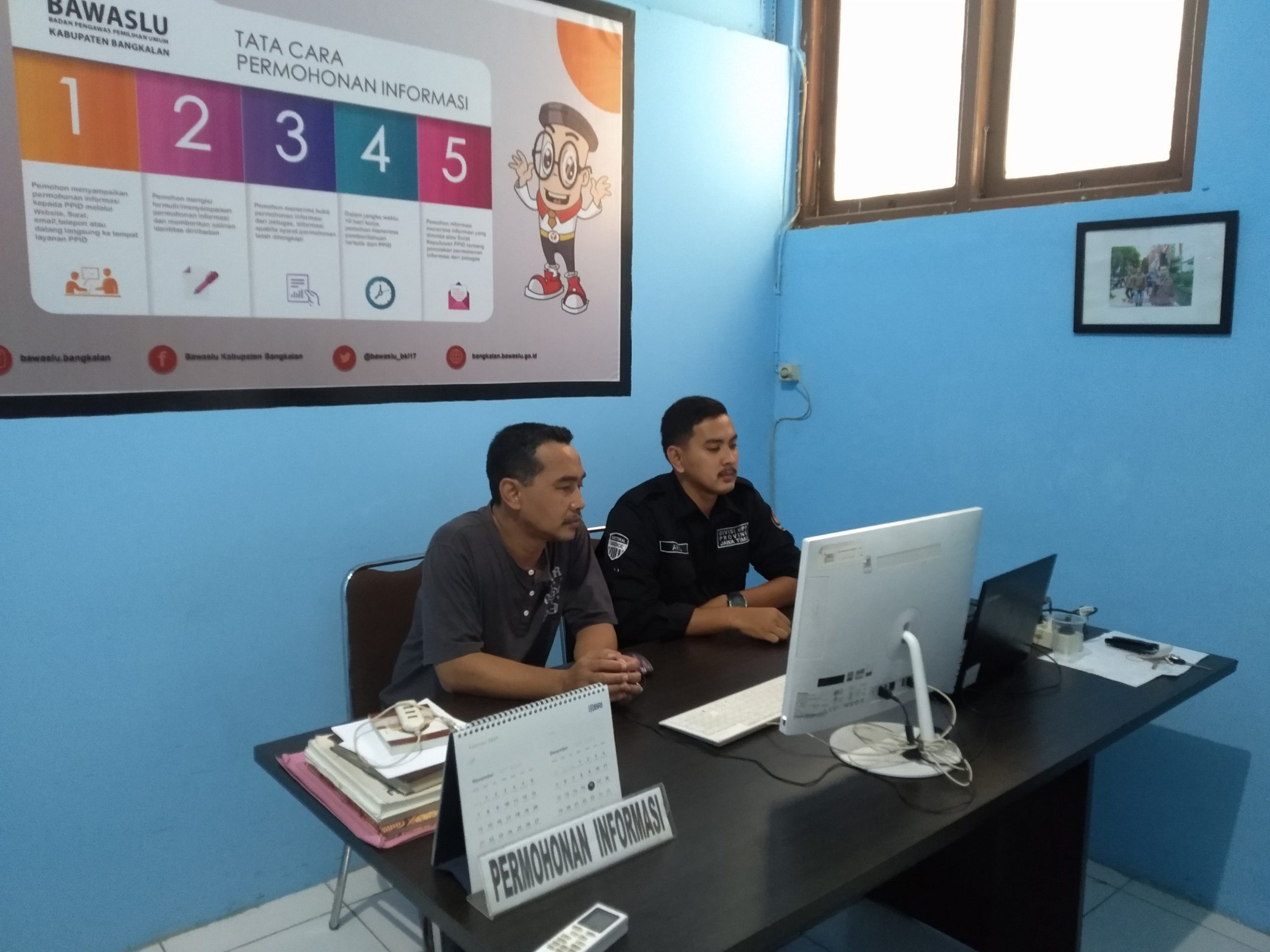 Tampak Moh. Masyhuri (kiri) dan staf saat mengikuti diskusi mingguan yang diselenggarakan oleh Bawaslu Jatim