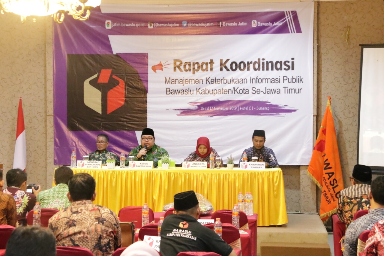 bangkalan.bawaslu.go.id - Untuk Peningkatan manajemen keterbukaan Informasi Publik Bawaslu Provinsi Jawa Timur (Jatim) gelar rapat koordinasi bertempat di Hotel C 1 Sumenep.