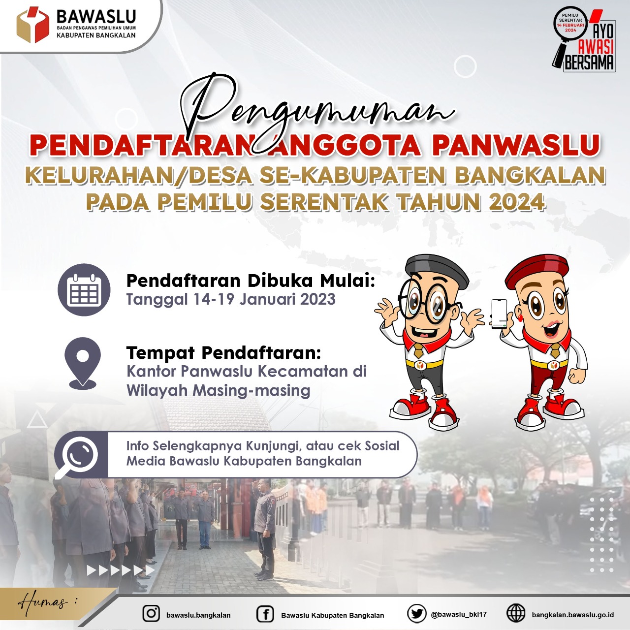 Berdasarkan Peraturan Badan Pengawas Pemilihan Republik Indonesia Nomor 19 Tahun 2017 sebagaimana diubah terakhir dengan Peraturan Badan Pengawas Pemilihan Umum Republik Indonesia Nomor 4 Tahun 2022, Bahwa Bawaslu membuka kesempatan bagi Warga Negara Indonesia yang memenuhi persyaratan untuk mendaftarkan diri sebagai calon anggota Panwaslu Kelurahan/Desa.