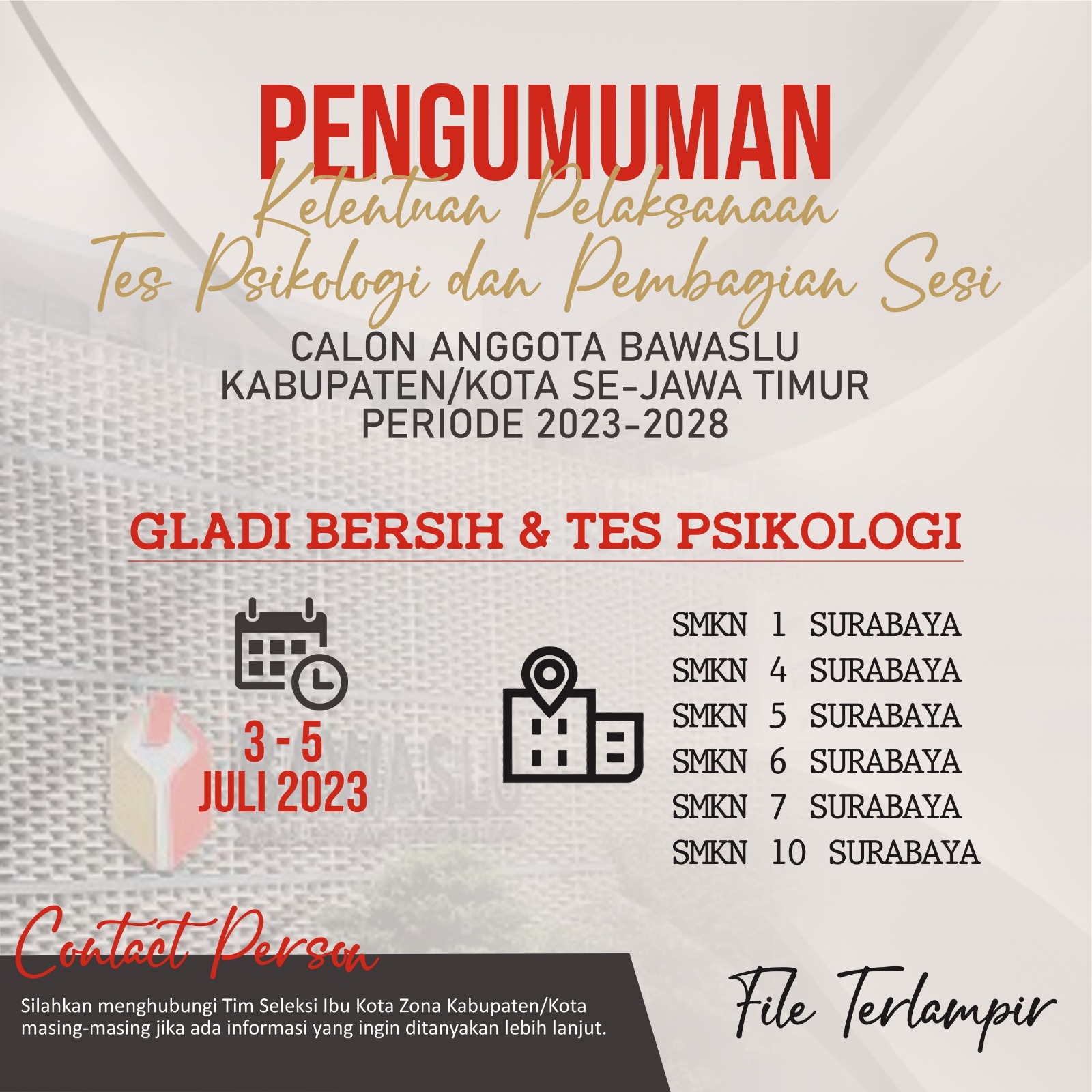PENGUMUMAN KETENTUAN PELAKSANAAN TES PSIKOLOGI DAN PEMBAGIAN SESI CALON ANGGOTA BAWASLU KABUPATEN/KOTA SE-JAWA TIMUR MASA JABATAN 2023 – 2028
