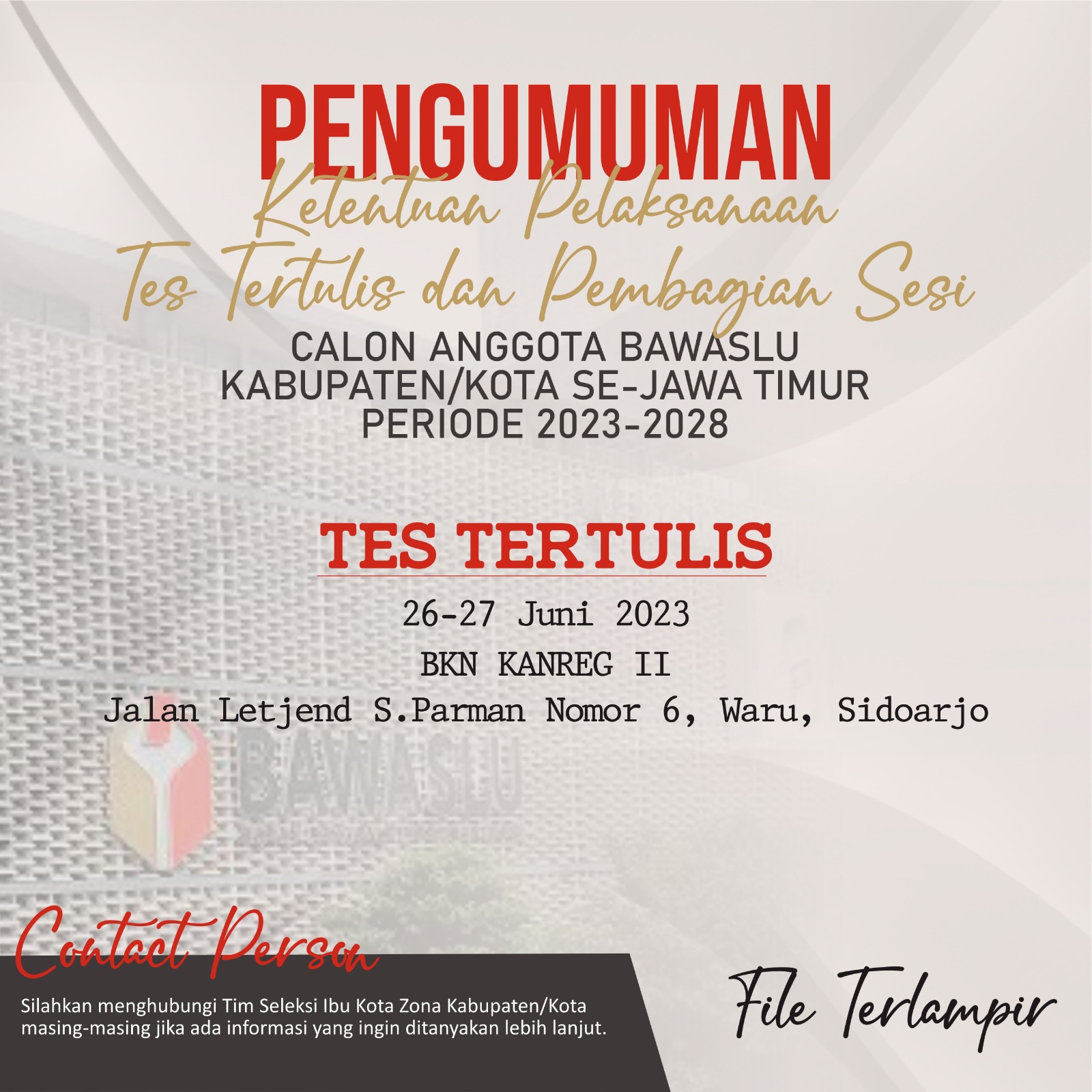 PENGUMUMAN KETENTUAN PELAKSANAAN TES TERTULIS DAN PEMBAGIAN SESI CALON ANGGOTA BAWASLU KABUPATEN/KOTA MASA JABATAN 2023 – 2028