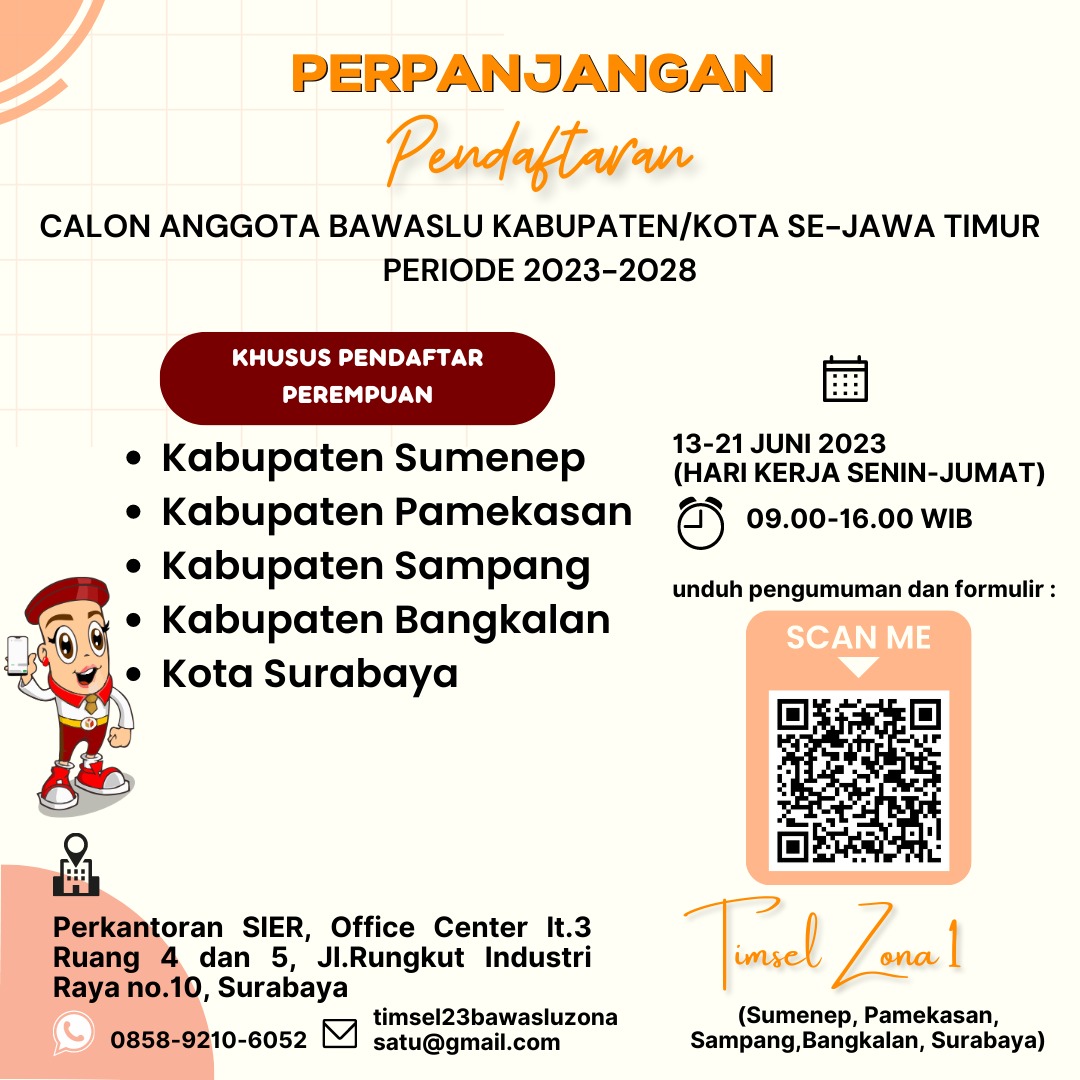 Berdasarkan Keputusan Ketua Bawaslu Nomor 176/HK.01.01/K1/05/2023 atas kewenangan yang diberikan oleh Undang-Undang Nomor 7 Tahun 2017 tentang Pemilihan Umum, serta memperhatikan jumlah kebutuhan pendaftar dan keterwakilan pendaftar perempuan pada masng-masing Kabupaten/Kota di Provinsi Jawa Timur Zona 1, sebagaimana dimaksud pada Pedoman Pelaksanaan Pembentukan Bawaslu Kabupaten/Kota Masa Jabatan 2023-2028 pada bagian perpanjangan masa pendaftaran, maka Tim Seleksi Calon Anggota Bawaslu Kabupaten/Kota Provinsi Jawa Timur Zona 1 memperpanjang masa pendaftaran Khusus pendaftar perempuan.