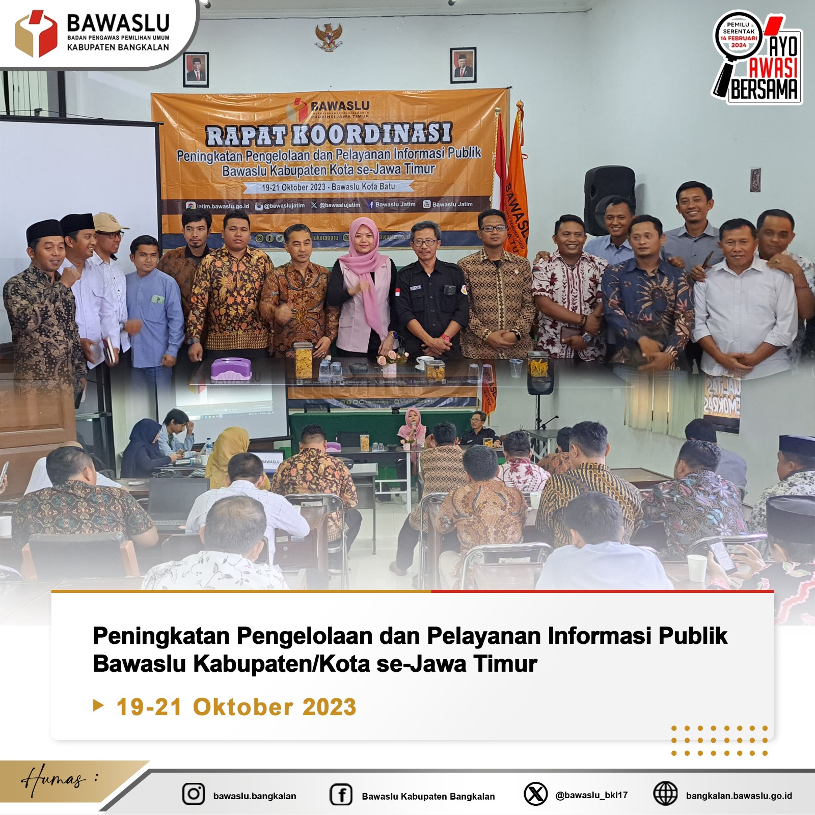 Dalam rangka peningkatan kualitas pengelolaan dan pelayanan keterbukaan informasi publik menghadapi Pemilu tahun 2024, Bawaslu Jawa Timur mengadakan rapat koordinasi dengan Bawaslu Kabupaten/kota se-Jawa Timur.