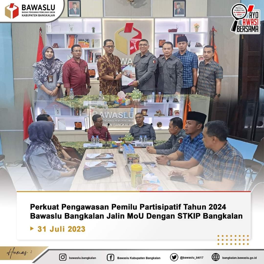 Bawaslu Kabupaten Bangkalan kembali tanda tangani MoU, Kali ini dengan Kampus STKIP PGRI Kabupaten Bangkalan. Penandatanganan MoU dilaksanakan di kantor Bawaslu Kabupaten Bangkalan dengan pihak STKIP Bangkalan, Senin (31/07/2023).