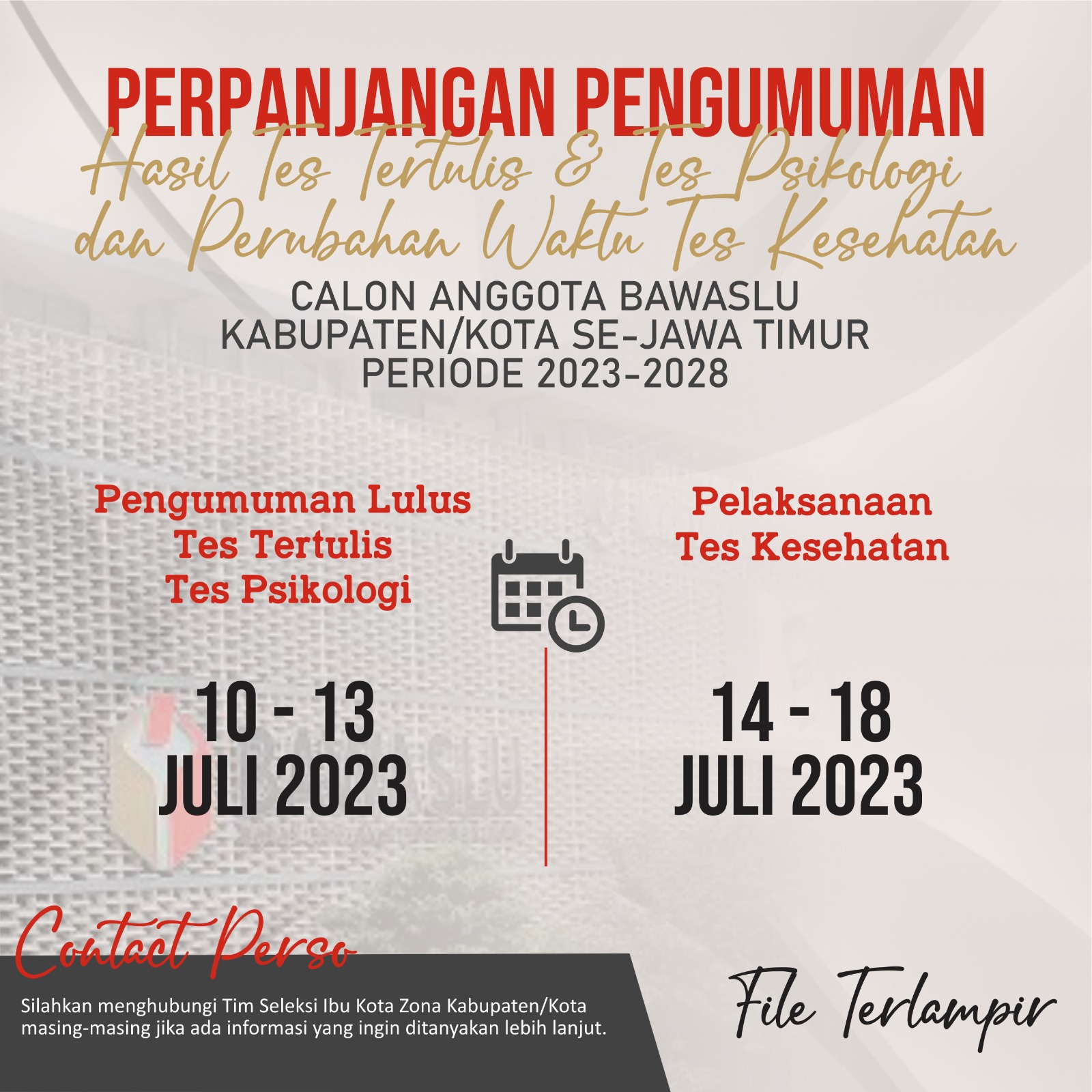 Perpanjangan Pengumuman Hasil Tes Tertulis dan Tes Psikologi dan Perubahan Waktu Pelaksanaan Tes Kesehatan humas | Selasa, Juli 11, 2023 - 15:56 Perpanjangan-Pengumuman-Hasil-Tes-Tertulis-dan-Tes-Psikologi-dan-Perubahan-Waktu-Pelaksanaan-Tes-Kesehatan Tag Berita Pemilu 2024 Pengumuman Share Berita Terkini humas Kamis, November 20, 2025 - 18:52 Menutup Rangkaian Penguatan Kelembagaan, Bawaslu Jatim Mengusung Tema Semangat Kepahlawanan humas Minggu, November 16, 2025 - 22:42 Totok: Kerja Pengawas Pemilu di Non Tahapan Membangun Konsolidasi Demokrasi humas Sabtu, November 15, 2025 - 11:01 Menjaga Akurasi Data Pemilih, Coktas Momentum Mengajak Mayarakat Melakukan Perekaman e-KTP Lihat Lainnya