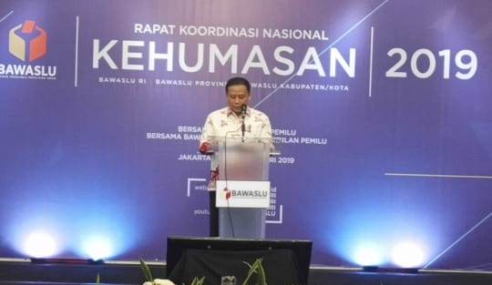 Ketua Bawaslu RI, Abhan menyampaikan sambutan sekaligus membuka acara Rapat Koordinasi Nasional Kehumasan Bawaslu RI tahun 2019 di Hotel Royal Kuningan Jakarta pada tanggal 26-28 Februari 2019.