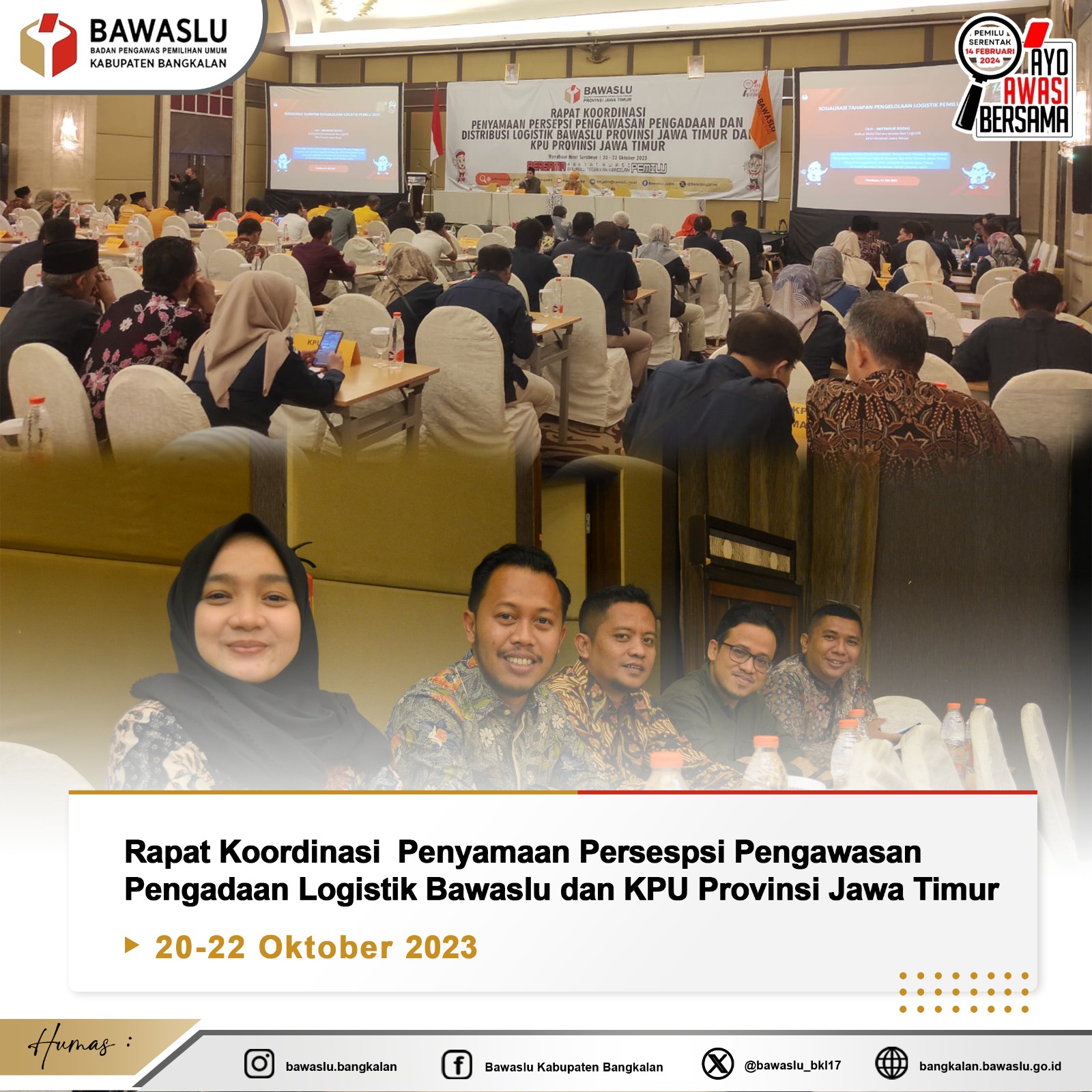 Bawaslu Kabupaten Bangkalan mengikuti rapat koordinasi penyamaan persepsi pengawasan pengadaan dan distribusi logistik Bawaslu Provinsi jawa timur dan KPU Provinsi Jawa Timiur, (20-22/10/23) di Hotel Wyndham Surabaya.