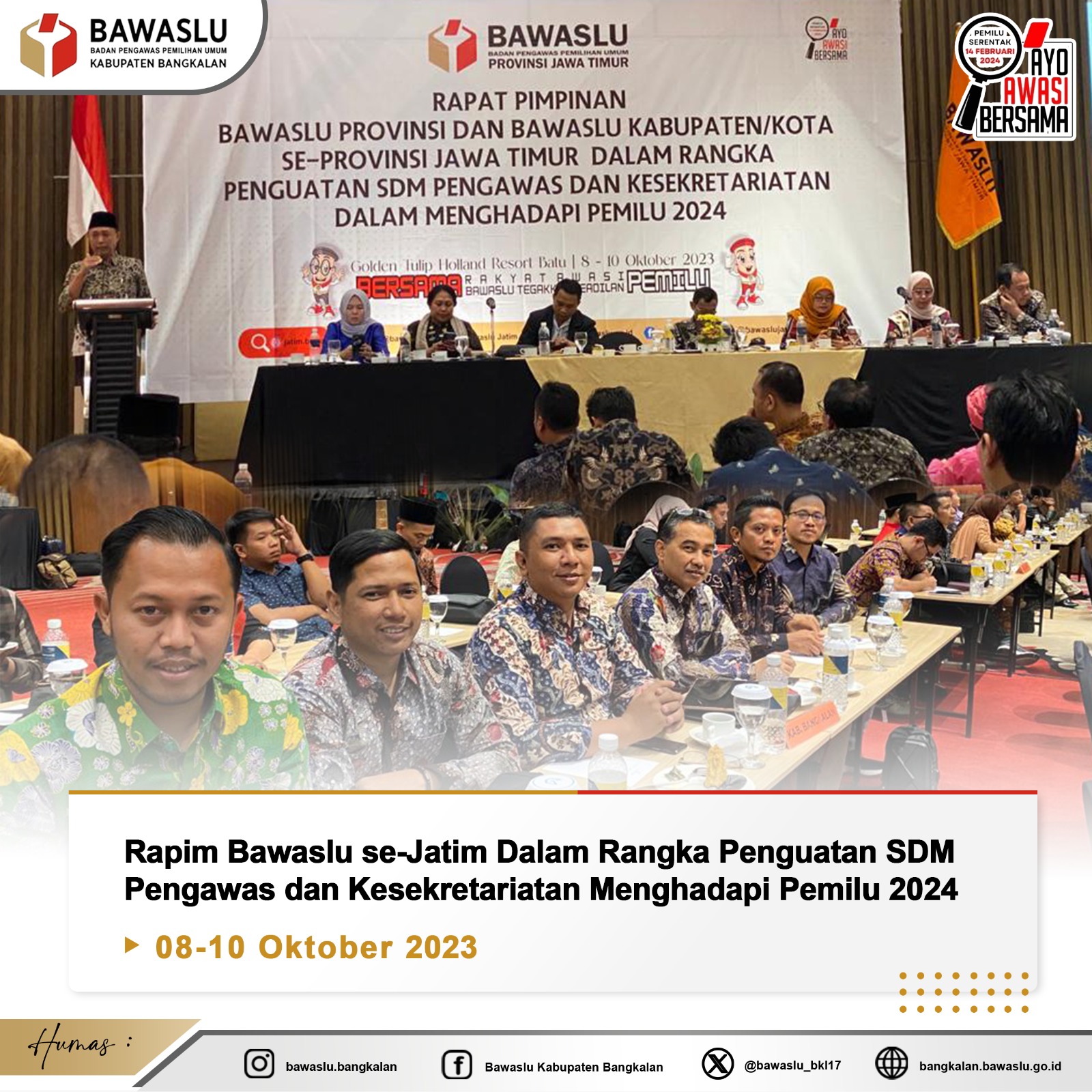 Rapat Pimpinan Bawaslu Provinsi dan Bawaslu Kabupaten/Kota Se-Provinsi Jawa Timur Dalam Rangka Penguatan SDM Pengawas dan Kesrekretariatan Dalam Menghadapi Pemilu Tahun 2024.