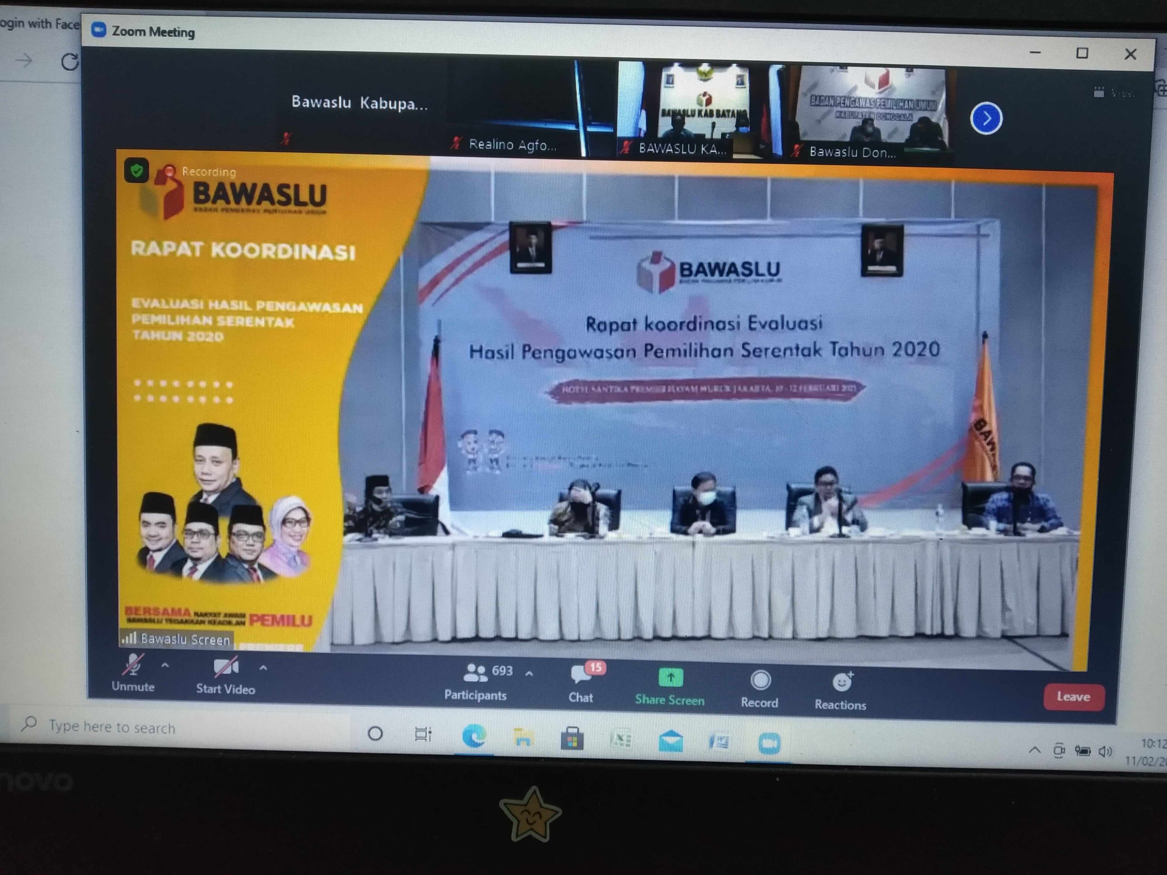 bangkalan.bawaslu.go.id - Sehubungan telah dilaksanakan pemilihan serentak tahun 2020, Bawaslu RI divisi pengawasan menggelar rapat koordinasi nasional (Rakornas) secara daring pada tanggal 10 sampai 12 Februari 2021. Rakornas tersebut dalam rangka mengevaluasi hasil pengawasan pemilihan serentak tahun 2020. Peserta yang hadir secara daring via aplikasi zoom kordinator divisi pengawasan dan hubungan antar lembaga tingkat Bawaslu provinsi dan Bawaslu Kabupaten/Kota Se-Indonesia.