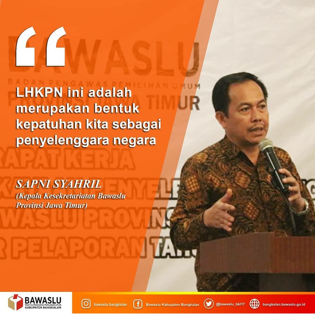 Laporan LHKPN merupakan wujud pertanggung jawaban penyelenggara negara. Bawaslu berkomitmen mendukung upaya memperkuat kelembagaan di mata public dan mendorong terciptanya pemerintahan yang bersih. Hal ini disampaikan oleh sapni dalam sambutanya dipembukaan rapat kerja Bawaslu Jawa Timur d Prigen-Pasuruan, 2 Maret 2010.
