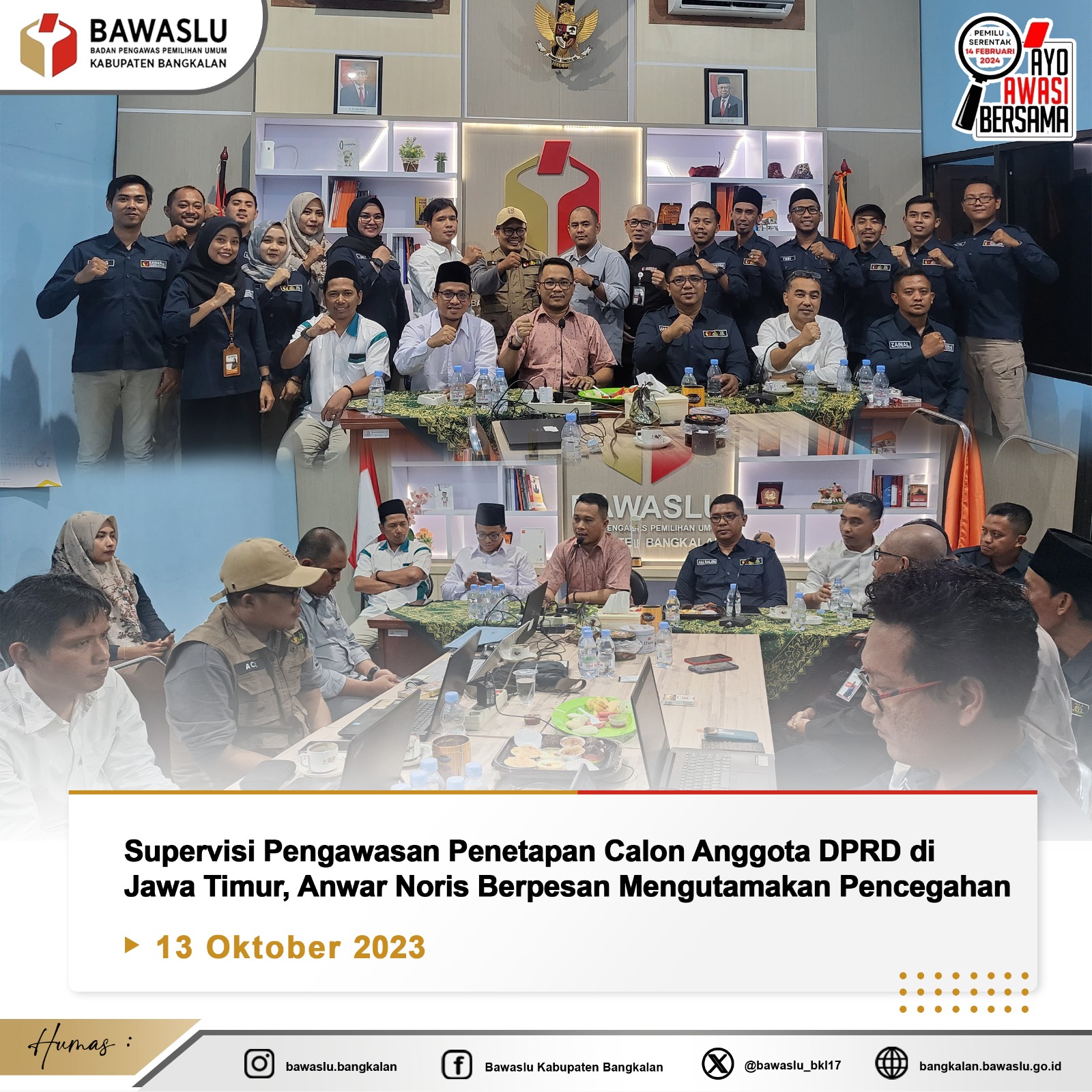 Supervisi pengawasan penetapan calon anggota DPRD di Jawa Timur, Anwar Noris anggota Bawaslu Jatim berpasan agar jajaran Bawaslu Kabupaten/kota mengutamakan pencegahan. Pesan tersebut di sampaikan Anwar Noris saat supervisi ke Kantor Bawaslu Bangkalan, Jumat (13/10/23).