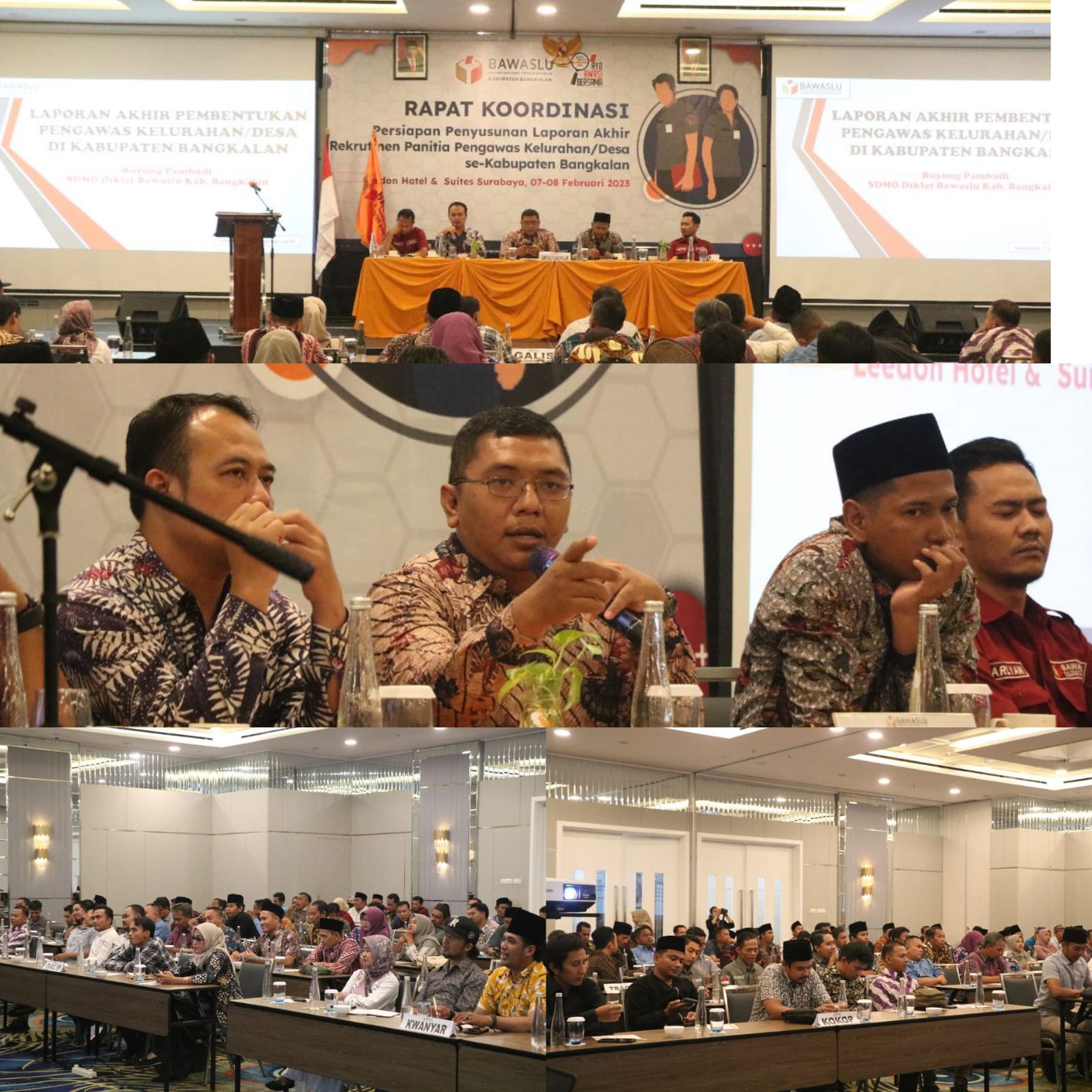 bangkalan.bawaslu.go.id - Sebagai bentuk pertanggung jawaban kinerja dalam rekrutmen pengawas pemilu Kelurahan/desa di 18 kecamatan untuk pemilu tahun 2024, Bawaslu Kabupaten Bangkalan menggelar rapat koordinasi persiapan penyusunan laporan akhir, (07-08/02/23) bertempat di Hotel Leedon Surabaya.