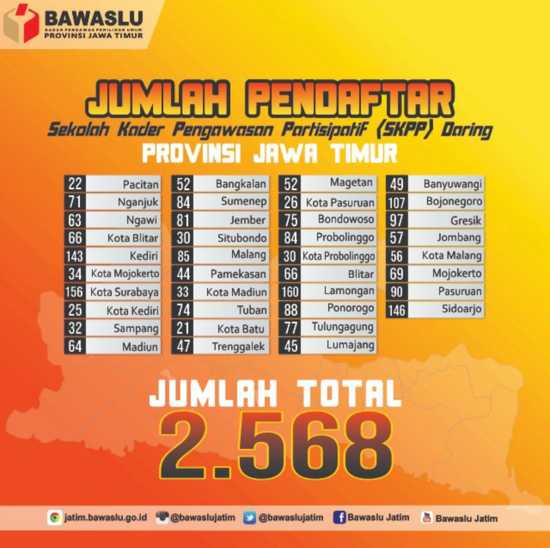 Ketua Bawaslu Bangkalan, Ahmad Mustain Saleh menyampaikan ada 54 pendaftar dari Kabupaten Bangkalan, “ berdasarkan rincian pendaftar SKPP yang dikeluarkan Bawaslu Provinsi Jatim, Kabupaten Bangkalan ada 54 orang pendaftar dari total 2.568 orang Se-jawa Timur", terangnya.