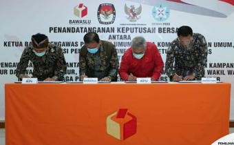 Bawaslu RI gelar penandatanganan keputusan bersama Komisi Pemilihan Umum (KPU), Komisi Penyiaran Indonesia (KPI) dan Dewan Pers, Rabu (12/8) bertempat di kantor Bawaslu RI.