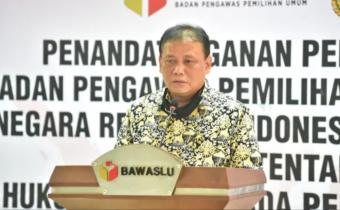 Ketua Bawaslu RI (Abhan) saat memberikan sambutan saat penandatanganan peraturan bersama tentang sentra penegakan hukum tepadu