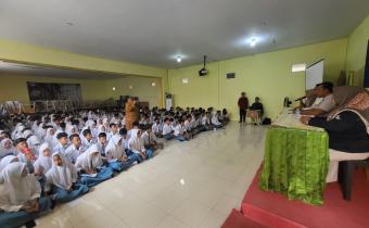 Dihadapan siswa SMKN 1 Arosbaya Abdul Aziz anggota Bawaslu Kabupaten Bangkalan menjelaskan proses pengawasan dan penindakan pelanggaran pada tahapan pemilu tahun 2024, Selasa (31/01/23).