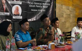 Ketua Bawaslu Kabupaten Bangkalan Ahmad Mustain Saleh menghadiri undangan diskusi panel dengan tema Peran Generasi Milenial dalam Pemilu Raya, Senin petang (18/07/22) bertempat di Cafe Alas Bhumeh.